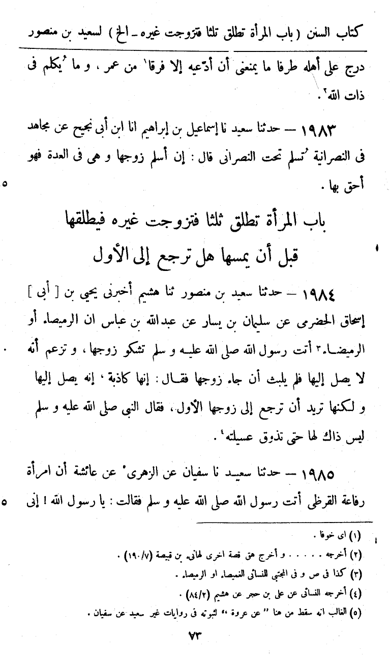 1985 - حَدَّثَنَا سَعِيدٌ، نا سُفْيَانُ، عَنِ الزُّهْرِيِّ، عَنْ عَائِشَةَ، أَنَّ امْرَأَةَ رِفَاعَةَ الْقُرَظِيِّ أَتَتْ رَسُولَ اللَّهِ صَلَّى اللهُ عَلَيْهِ وَسَلَّمَ فَقَالَتْ: يَا رَسُولَ اللَّهِ إِنِّي -[74]- كُنْتُ عِنْدَ رِفَاعَةَ فَطَلَّقَنِي وَبَتَّ طَلَاقِي، فَتَزَوَّجَنِي ابْنُ الزُّبَيْرِ، وَمَا مَعَهُ إِلَّا مِثْلُ هُدْبَةِ الثَّوْبِ، فَتَبَسَّمَ رَسُولُ اللَّهِ صَلَّى اللهُ عَلَيْهِ وَسَلَّمَ فَقَالَ: «§أَتُرِيدِينَ أَنْ تَرْجِعِي إِلَى رِفَاعَةَ؟ لَا، حَتَّى تَذُوقِي عُسَيْلَتَهُ وَيَذُوقَ عُسَيْلَتَكِ» فَنَادَى خَالِدُ بْنُ سَعِيدٍ وَهُوَ بِالْبَابِ: أَلَا تَسْمَعُ يَا أَبَا بَكْرٍ مَا تَجْهَرُ هَذِهِ عِنْدَ رَسُولِ اللَّهِ صَلَّى اللهُ عَلَيْهِ وَسَلَّمَ؟