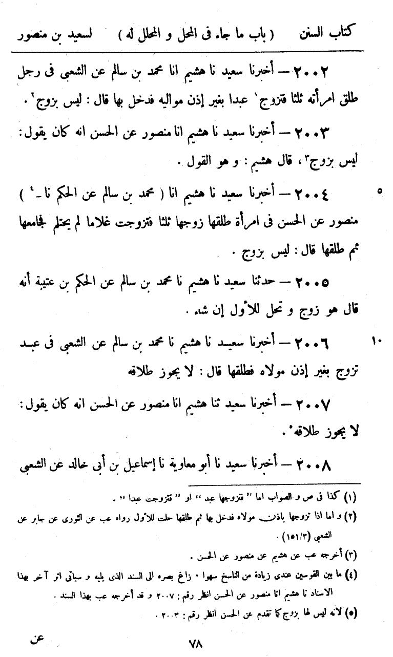 2004 - أَخْبَرَنَا سَعِيدٌ، نا هُشَيْمٌ، أنا مُحَمَّدُ بْنُ سَالِمٍ، عَنِ الْحَكَمِ، نا مَنْصُورٌ، عَنِ الْحَسَنِ، فِي §امْرَأَةٍ طَلَّقَهَا زَوْجُهَا ثَلَاثًا، فَتَزَوَّجَتْ غُلَامًا لَمْ يَحْتَلِمْ فَجَامَعَهَا، ثُمَّ طَلَّقَهَا قَالَ: «لَيْسَ بِزَوْجٍ»