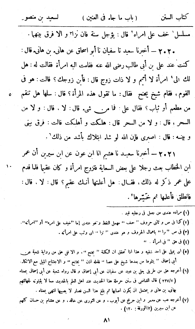 2021 - أَخْبَرَنَا سَعِيدٌ، نا هُشَيْمٌ، أنا ابْنُ عَوْنٍ، عَنِ ابْنِ سِيرِينَ، أَنَّ عُمَرَ بْنَ الْخَطَّابِ، بَعَثَ رَجُلًا عَلَى بَعْضِ السِّعَايَةِ فَتَزَوَّجَ امْرَأَةً، وَكَانَ عَقِيمًا، فَلَمَّا قَدِمَ عَلَى عُمَرَ ذَكَرَ لَهُ ذَلِكَ، فَقَالَ: «§هَلْ أَعْلَمْتَهَا أَنَّكَ عَقِيمٌ؟» قَالَ: لَا، قَالَ: «فَانْطَلِقْ فَأَعْلِمْهَا ثُمَّ خَيِّرْهَا»