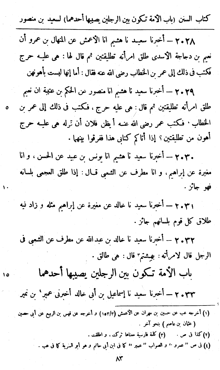 2030 - أَخْبَرَنَا سَعِيدٌ، نا هُشَيْمٌ، أنا يُونُسُ بْنُ عُبَيْدٍ، عَنِ الْحَسَنِ، وَأنا مُغِيرَةُ، عَنْ إِبْرَاهِيمَ، وَأنا مُطَرِّفٌ، عَنِ الشَّعْبِيِّ، قَالَ: «§إِذَا طَلَّقَ الْعَجَمِيُّ بِلِسَانِهِ فَهُوَ جَائِزٌ»