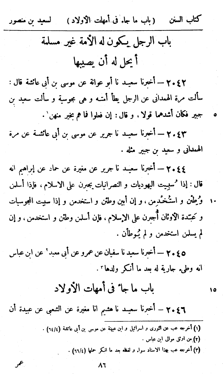2042 - أَخْبَرَنَا سَعِيدٌ، نا أَبُو عَوَانَةَ، عَنْ مُوسَى بْنِ أَبِي عَائِشَةَ، قَالَ: سَأَلْتُ مُرَّةَ الْهَمْدَانِيَّ عَنِ §الرَّجُلِ يَطَأُ أَمَتَهُ وَهِيَ مَجُوسِيَّةٌ، وَسَأَلْتُ سَعِيدَ بْنَ جُبَيْرٍ فَكَانَ أَشَدَّهُمَا قَوْلًا، وَقَالَ: «إِنْ فَعَلُوا فَمَا هُمْ بِخَيْرٍ مِنْهُنَّ»