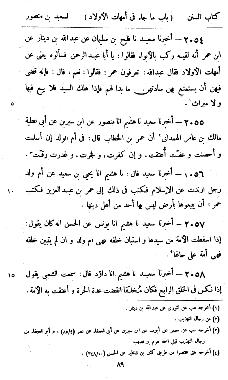 2055 - أَخْبَرَنَا سَعِيدٌ، نا هُشَيْمٌ، أنا مَنْصُورٌ، عَنِ ابْنِ سِيرِينَ، عَنْ أَبِي عَطِيَّةَ مَالِكِ بْنِ عَامِرٍ الْهَمْدَانِيِّ، أَنَّ عُمَرَ بْنَ الْخَطَّابِ، قَالَ فِي §أُمِّ الْوَلَدِ: «إِنْ أَسْلَمَتْ وَأُحْصِنَتْ وَعَفَّتْ أُعْتِقَتْ وَإِنْ كَفَرَتْ، وَفَجَرَتْ، وَغَدَرَتْ رَقَّتْ»
