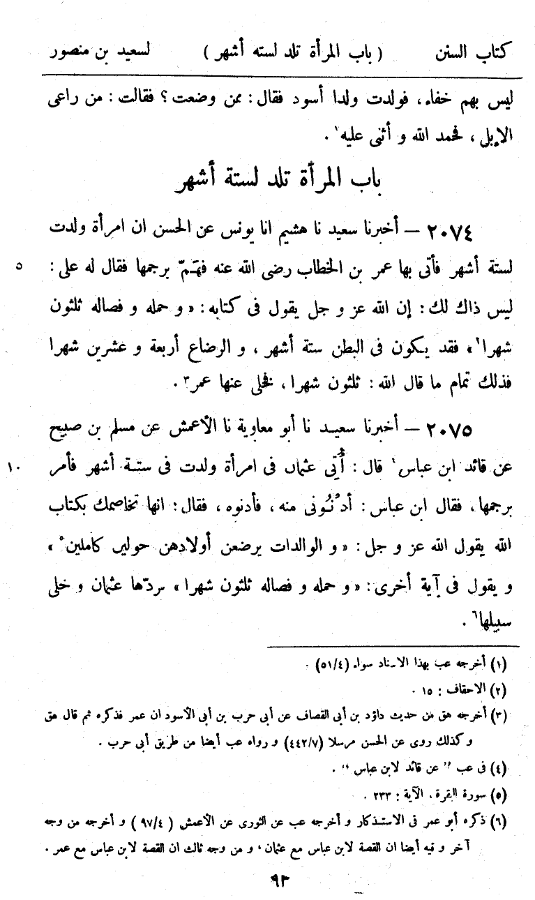2074 - أَخْبَرَنَا سَعِيدٌ، نا هُشَيْمٌ، أنا يُونُسُ، عَنِ الْحَسَنِ أَنَّ امْرَأَةً وَلَدَتْ لِسِتَّةِ أَشْهُرٍ، فَأُتِيَ بِهَا عُمَرُ بْنُ الْخَطَّابِ رَضِيَ اللَّهُ عَنْهُ فَهَمَّ بِرَجْمِهَا، فَقَالَ لَهُ عَلِيٌّ: لَيْسَ ذَاكَ لَكَ: إِنَّ اللَّهَ عَزَّ وَجَلَّ يَقُولُ فِي كِتَابِهِ: {§وَحَمْلُهُ وَفِصَالُهُ ثَلَاثُونَ شَهْرًا} [الأحقاف: 15] ، فَقَدْ يَكُونُ فِي الْبَطْنِ سِتَّةَ أَشْهُرٍ، وَالرَّضَاعُ أَرْبَعَةً وَعِشْرِينَ شَهْرًا، فَذَلِكَ تَمَامُ مَا قَالَ اللَّهُ: ثَلَاثُونَ شَهْرًا، فَخَلَّى عَنْهَا عُمَرُ
