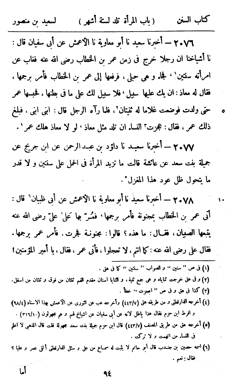 2076 - أَخْبَرَنَا سَعِيدٌ، نا أَبُو مُعَاوِيَةَ، نا الْأَعْمَشُ، عَنْ أَبِي سُفْيَانَ، قَالَ: نا أَشْيَاخُنَا أَنَّ رَجُلًا خَرَجَ فِي زَمَنِ عُمَرَ بْنِ الْخَطَّابِ رَضِيَ اللَّهُ عَنْهُ فَغَابَ عَنِ امْرَأَتِهِ سَنَتَيْنِ، فَجَاءَ وَهِيَ حُبْلَى فَرَفَعَهَا إِلَى عُمَرَ بْنِ الْخَطَّابِ فَأَمَرَ بِرَجْمِهَا، فَقَالَ لَهُ مُعَاذٌ: «§إِنْ يَكُ عَلَيْهَا سَبِيلٌ، فَلَا سَبِيلَ لَكَ عَلَى مَا فِي بَطْنِهَا» ، فَحَبَسَهَا عُمَرُ حَتَّى وَلَدَتْ فَوَضَعَتْ غُلَامًا لَهُ ثِنْيَتَانِ، فَلَمَّا رَآهُ الرَّجُلُ قَالَ: ابْنِي ابْنِي، فَبَلَغَ ذَلِكَ عُمَرَ، فَقَالَ: «عَجَزَتِ النِّسَاءُ أَنْ تَلِدَ مِثْلَ مُعَاذٍ، لَوْلَا مُعَاذٌ هَلَكَ عُمَرُ»