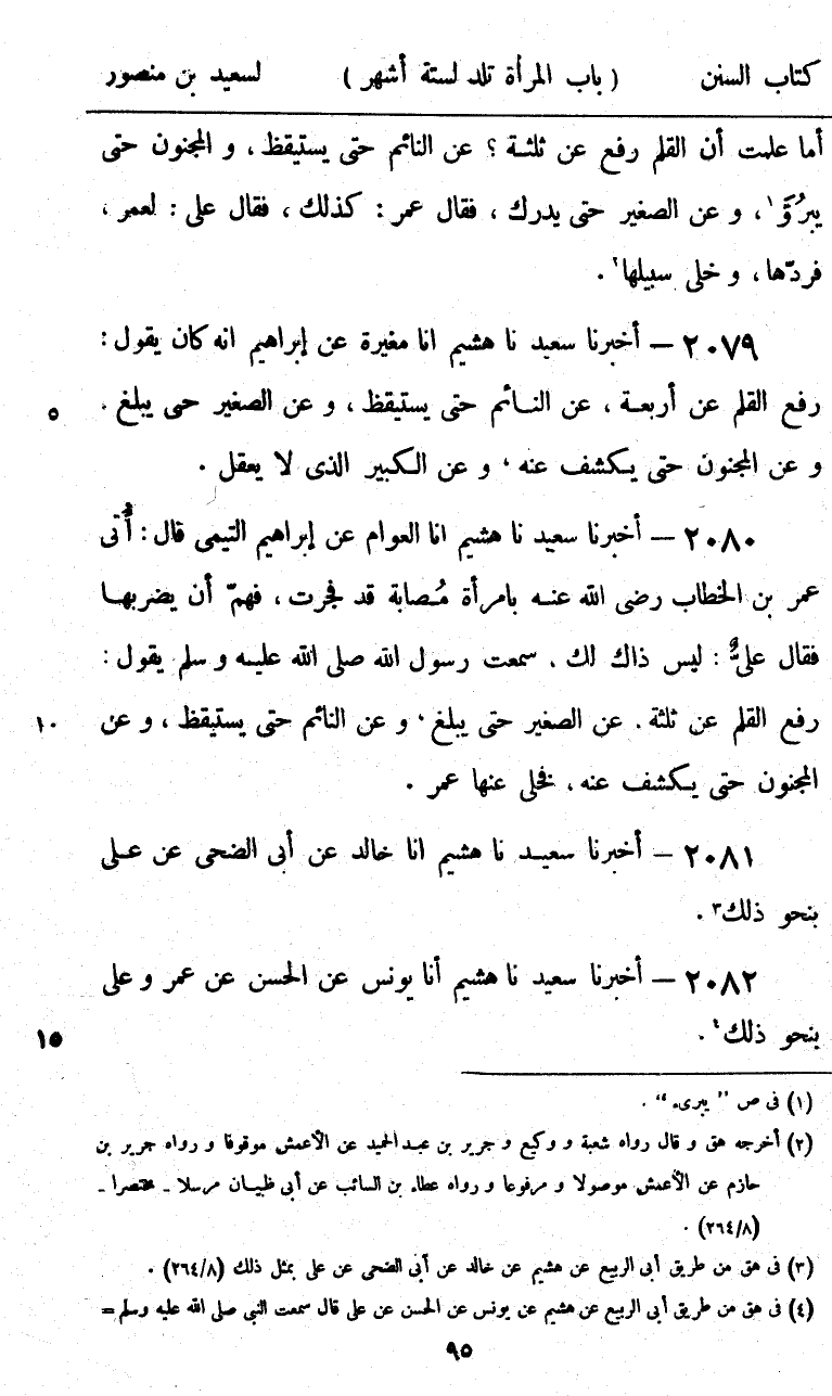 2080 - أَخْبَرَنَا سَعِيدٌ، نا هُشَيْمٌ، أنا الْعَوَّامُ، عَنْ إِبْرَاهِيمَ التَّيْمِيِّ، قَالَ: أُتِيَ عُمَرُ بْنُ الْخَطَّابِ رَضِيَ اللَّهُ عَنْهُ بِامْرَأَةٍ مُصَابَةٍ قَدْ فَجَرَتْ، فَهَمَّ أَنْ يَضْرِبَهَا فَقَالَ عَلِيٌّ: لَيْسَ ذَاكَ لَكَ، سَمِعْتُ رَسُولَ اللَّهِ صَلَّى اللهُ عَلَيْهِ وَسَلَّمَ يَقُولُ: «§رُفِعَ الْقَلَمُ عَنْ ثَلَاثَةٍ، عَنِ الصَّغِيرِ حَتَّى يَبْلُغَ، وَعَنِ النَّائِمِ حَتَّى يَسْتَيْقِظَ، وَعَنِ الْمَجْنُونِ حَتَّى يُكْشَفَ عَنْهُ» فَخَلَّى عَنْهَا عُمَرُ