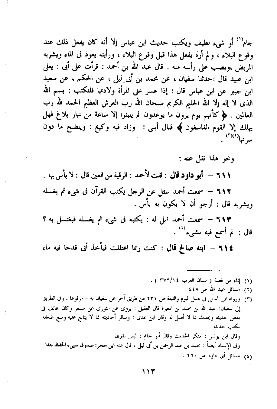612 - سمعت أحمد سئل عن الرجل يكتب القرآن فى شيء ثم يغسله ويشربه قال: أرجو أن لا يكون به بأس.