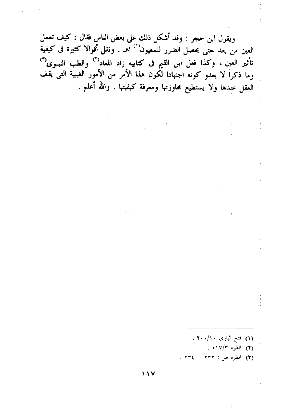 ويقول ابن حجر: وقد أشكل ذلك على بعض الناس فقال: كيف تعمل العين من بعد حتى يحصل الضرر للمعيون «1» اه. ونقل أقوالا كثيرة فى كيفية تأثير العين، وكذا فعل ابن القيم فى كتابيه زاد المعاد «2» والطب النبوى «3» وما ذكرا لا يعدو كونه اجتهادا لكون هذا الأمر من الأمور الغيبية التى يقف العقل عندها ولا يستطيع مجاوزتها ومعرفة كيفيتها. واللّه أعلم.