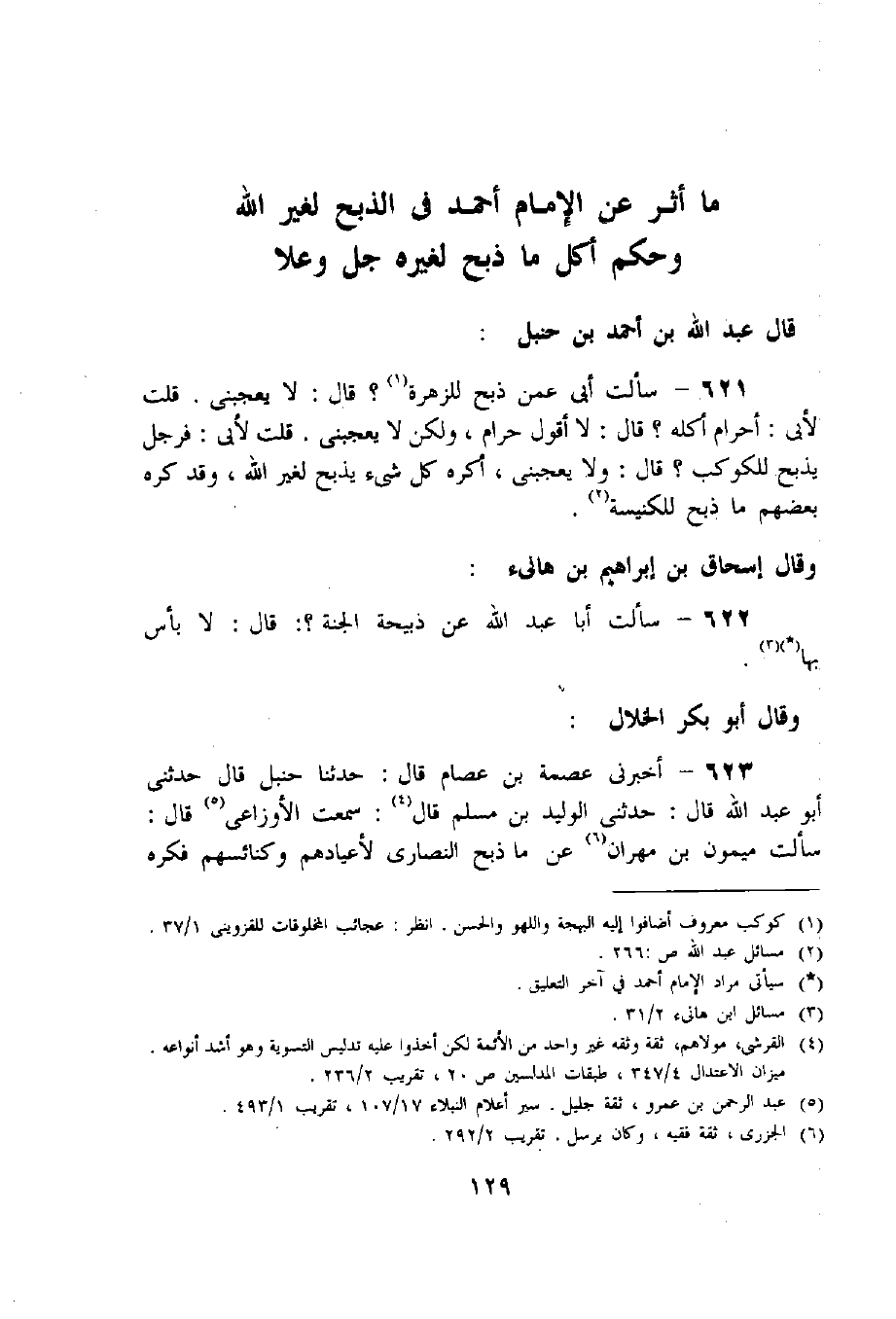 621 - سألت أبى عمن ذبح للزهرة «1»؟ قال: لا يعجبنى. قلت لأبى: أ حرام أكله؟ قال: لا أقول حرام، ولكن لا يعجبنى. قلت لأبى: فرجل يذبح للكوكب؟ قال: ولا يعجبنى، أكره كل شيء يذبح لغير اللّه، وقد كره بعضهم ما ذبح للكنيسة «2».