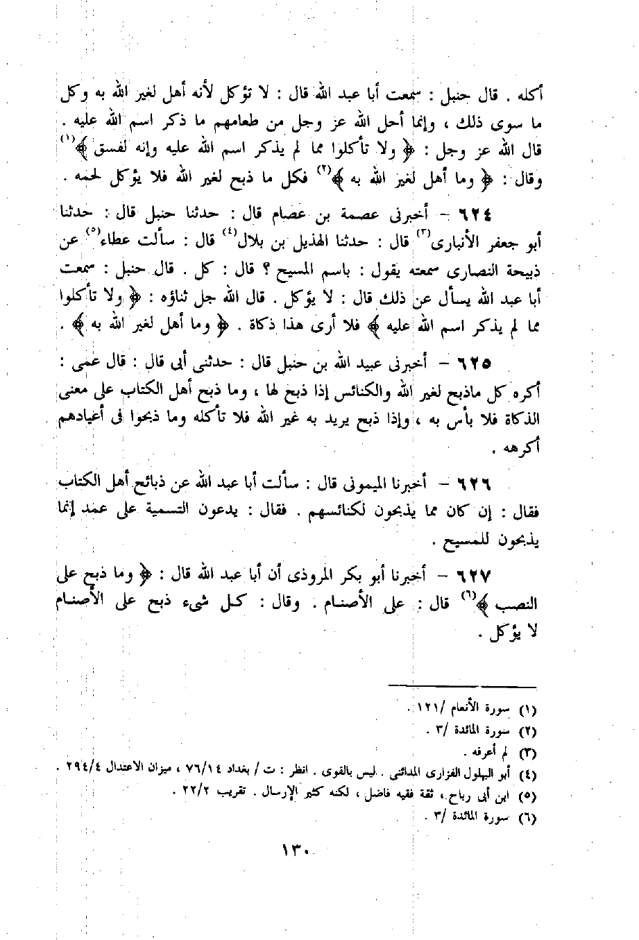 626 - أخبرنا الميمونى قال: سألت أبا عبد اللّه عن ذبائح أهل الكتاب فقال: إن كان مما يذبحون لكنائسهم. فقال: يدعون التسمية على عمد إنما يذبحون للمسيح.