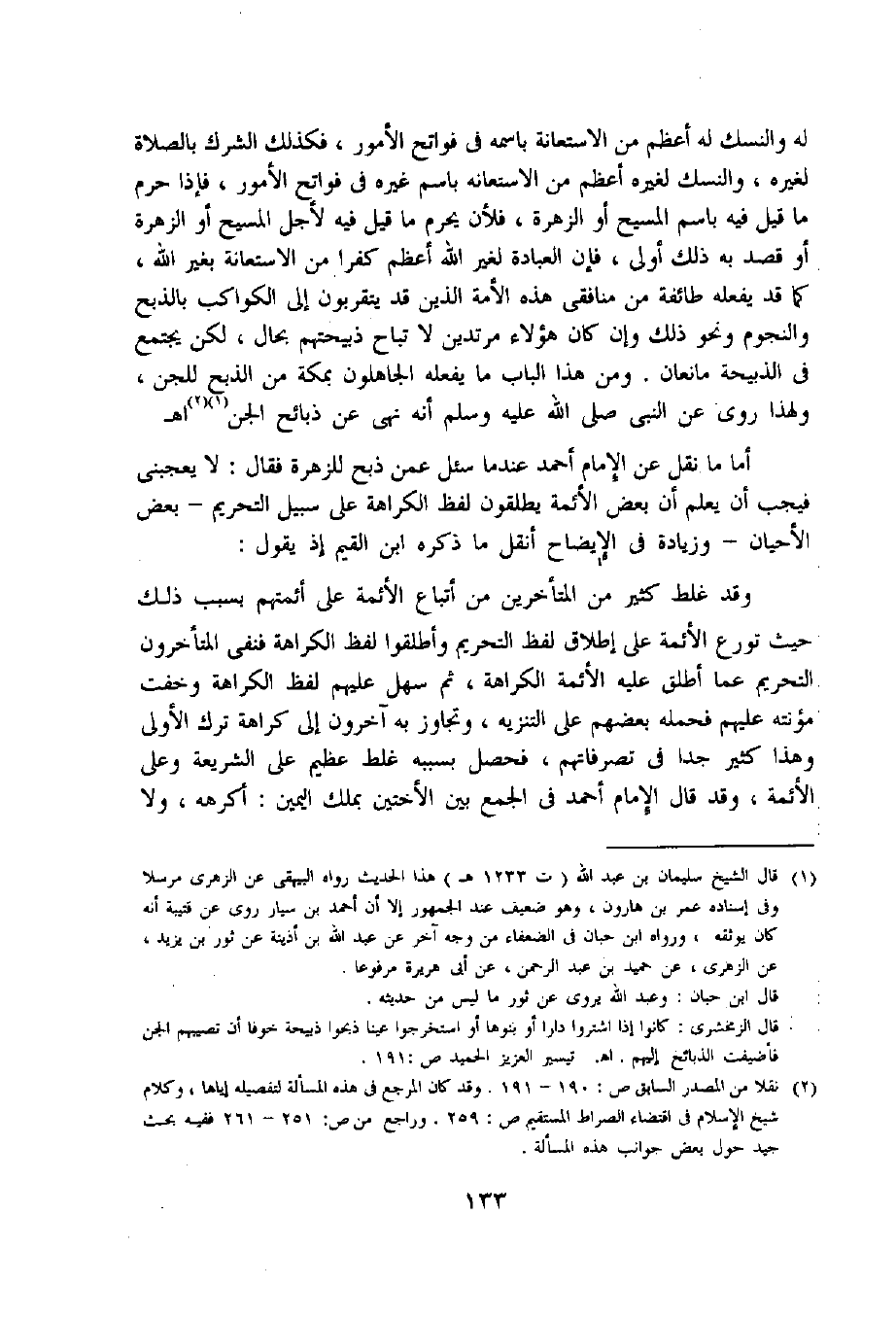 أما ما نقل عن الإمام أحمد عند ما سئل عمن ذبح للزهرة فقال: لا يعجبنى فيجب أن يعلم أن بعض الأئمة يطلقون لفظ الكراهة على سبيل التحريم- بعض الأحيان- وزيادة فى الإيضاح أنقل ما ذكره ابن القيم إذ يقول: