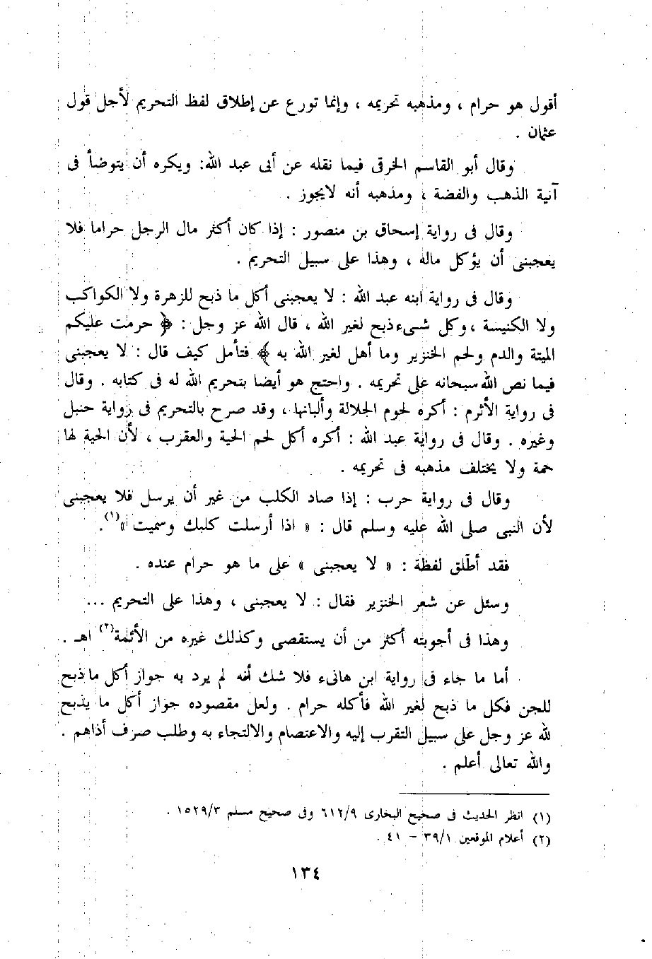 وقال فى رواية ابنه عبد اللّه: لا يعجبنى أكل ما ذبح للزهرة ولا الكواكب ولا الكنيسة، وكل شيء ذبح لغير اللّه، قال اللّه عز وجل: حُرِّمَتْ عَلَيْكُمُ الْمَيْتَةُ والدَّمُ ولَحْمُ الْخِنْزِيرِ وما أُهِلَّ لِغَيْرِ اللَّهِ بِهِ فتأمل كيف قال: لا يعجبنى فيما نص اللّه سبحانه على تحريمه. واحتج هو أيضا بتحريم اللّه له فى كتابه. وقال فى رواية الأثرم: أكره لحوم الجلالة وألبانها، وقد صرح بالتحريم فى رواية حنبل وغيره. وقال فى رواية عبد اللّه: أكره أكل لحم الحية والعقرب، لأن الحية لها حمة ولا يختلف مذهبه فى تحريمه.