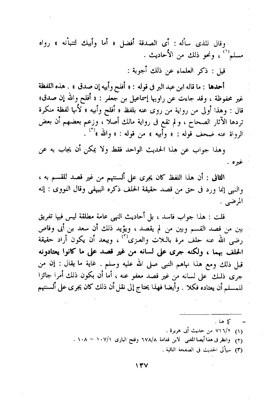 قلت: هذا جواب فاسد، بل أحاديث النهى عامة مطلقة ليس فيها تفريق بين من قصد القسم وبين من لم يقصد، ويؤيد ذلك أن سعد بن أبى وقاص رضى اللّه عنه حلف مرة باللات والعزى «3»، ويبعد أن يكون أراد حقيقة الحلف بهما، ولكنه جرى على لسانه من غير قصد على ما كانوا يعتادونه قبل ذلك ومع هذا نهاهم النبي صلى اللّه عليه وسلم. غاية ما يقال: إن من جرى ذلك على لسانه من غير قصد معفو عنه، أما أن يكون ذلك أمرا جائزا للمسلم أن يعتاده فكلا. وأيضا فهذا يحتاج إلى نقل أن ذلك كان يجرى على ألسنتهم