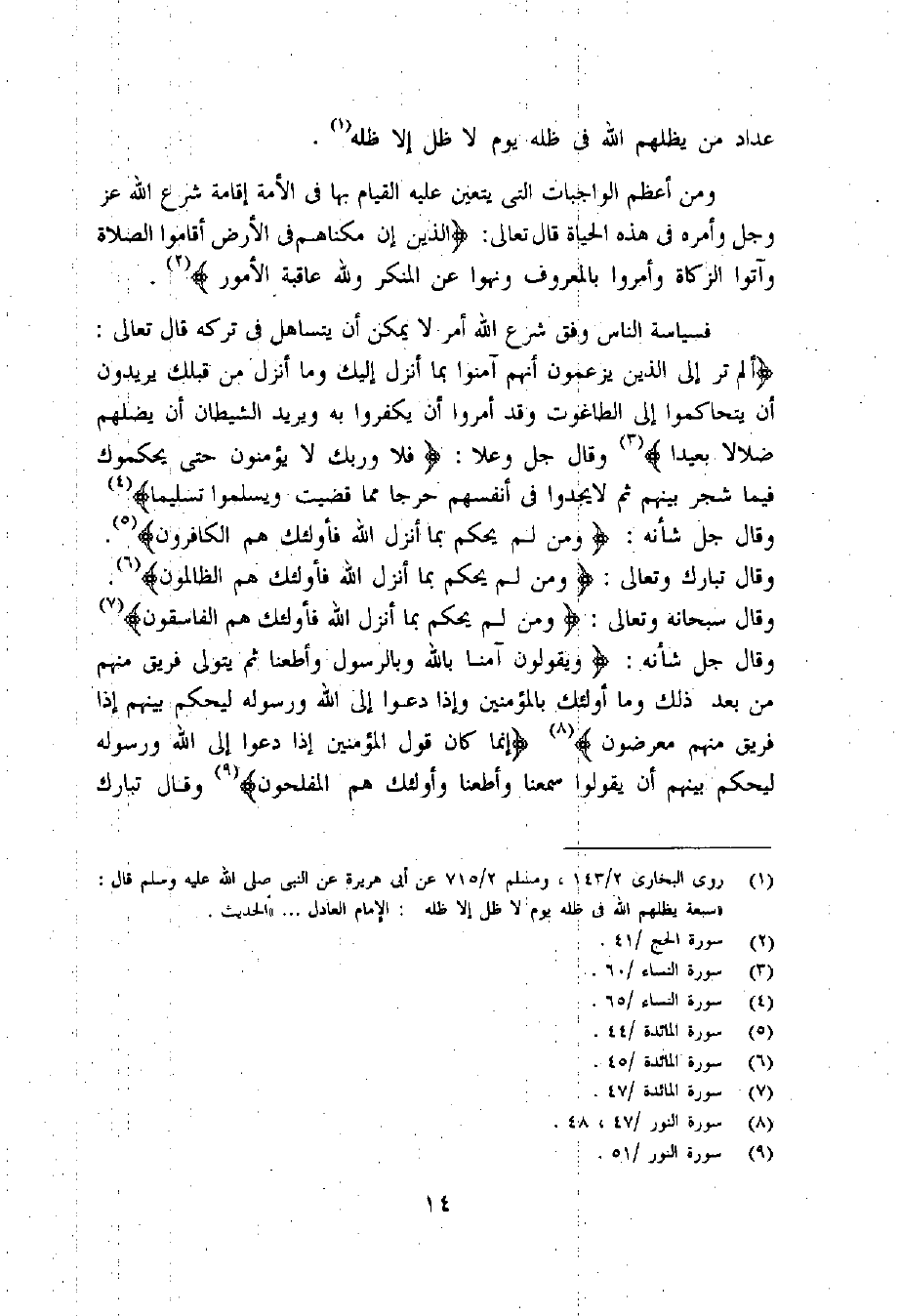 أَ لَمْ تَرَ إِلَى الَّذِينَ يَزْعُمُونَ أَنَّهُمْ آمَنُوا بِما أُنْزِلَ إِلَيْكَ وما أُنْزِلَ مِنْ قَبْلِكَ يُرِيدُونَ أَنْ يَتَحاكَمُوا إِلَى الطَّاغُوتِ وقَدْ أُمِرُوا أَنْ يَكْفُرُوا بِهِ ويُرِيدُ الشَّيْطانُ أَنْ يُضِلَّهُمْ ضَلالًا بَعِيداً «3» وقال جل وعلا: فَلا ورَبِّكَ لا يُؤْمِنُونَ حَتَّى يُحَكِّمُوكَ فِيما شَجَرَ بَيْنَهُمْ ثُمَّ لا يَجِدُوا فِي أَنْفُسِهِمْ حَرَجاً مِمَّا قَضَيْتَ ويُسَلِّمُوا تَسْلِيماً «4» وقال جل شأنه: ومَنْ لَمْ يَحْكُمْ بِما أَنْزَلَ اللَّهُ فَأُولئِكَ هُمُ الْكافِرُونَ «5».