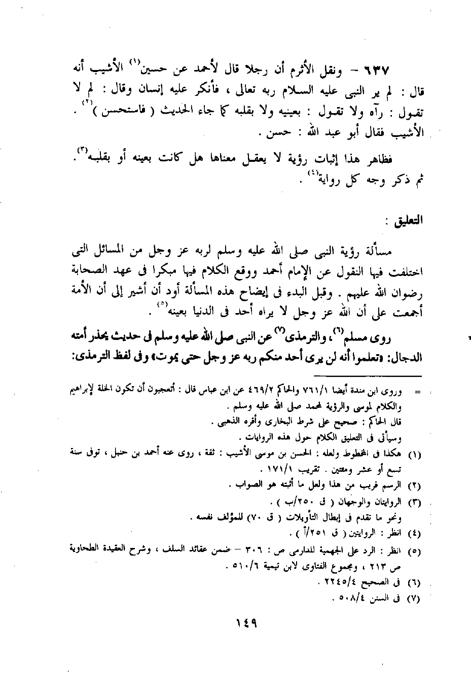 637 - ونقل الأثرم أن رجلا قال لأحمد عن حسين «1» الأشيب أنه قال: لم ير النبي عليه السلام ربه تعالى، فأنكر عليه إنسان وقال: لم لا تقول: رآه ولا تقول: بعينيه ولا بقلبه كما جاء الحديث (فاستحسن) «2».