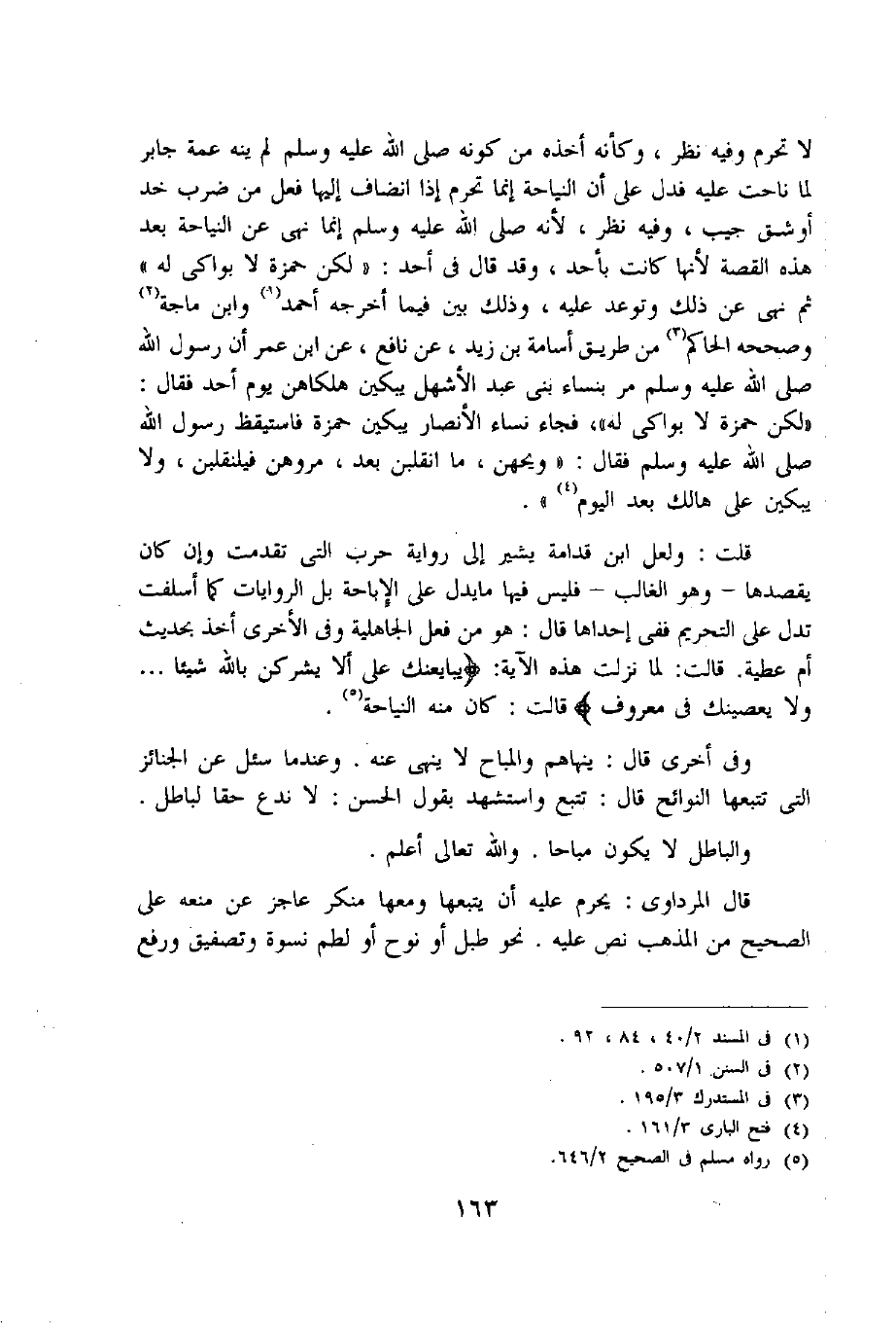 قلت: ولعل ابن قدامة يشير إلى رواية حرب التى تقدمت وإن كان يقصدها- وهو الغالب- فليس فيها ما يدل على الإباحة بل الروايات كما أسلفت تدل على التحريم ففى إحداها قال: هو من فعل الجاهلية وفى الأخرى أخذ بحديث أم عطية. قالت: لما نزلت هذه الآية: يُبايِعْنَكَ عَلى أَنْ لا يُشْرِكْنَ بِاللَّهِ شَيْئاً ...