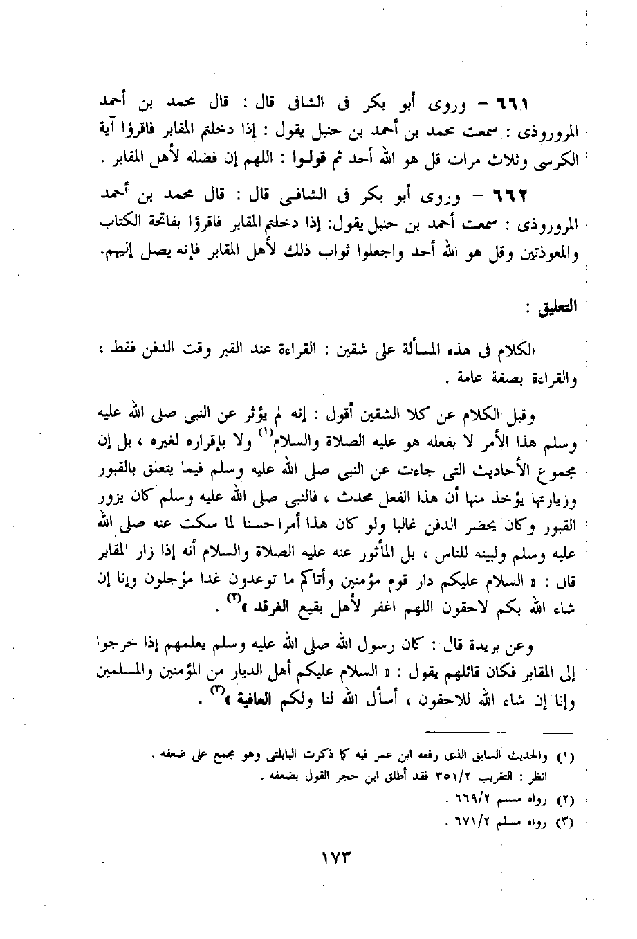 662 - وروى أبو بكر فى الشافى قال: قال محمد بن أحمد المروروذى: سمعت أحمد بن حنبل يقول: إذا دخلتم المقابر فاقرءوا بفاتحة الكتاب والمعوذتين وقل هو اللّه أحد واجعلوا ثواب ذلك لأهل المقابر فإنه يصل إليهم.