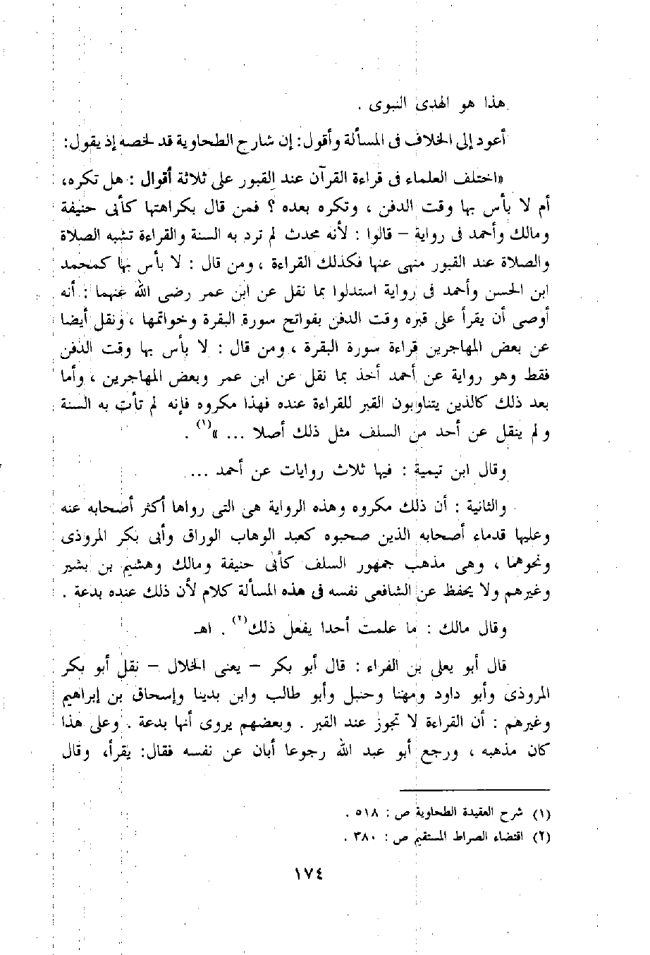 «اختلف العلماء فى قراءة القرآن عند القبور على ثلاثة أقوال: هل تكره، أم لا بأس بها وقت الدفن، وتكره بعده؟ فمن قال بكراهتها كأبي حنيفة ومالك وأحمد فى رواية- قالوا: لأنه محدث لم ترد به السنة والقراءة تشبه الصلاة والصلاة عند القبور منهى عنها فكذلك القراءة، ومن قال: لا بأس بها كمحمد ابن الحسن وأحمد فى رواية استدلوا بما نقل عن ابن عمر رضى اللّه عنهما: أنه أوصى أن يقرأ على قبره وقت الدفن بفواتح سورة البقرة وخواتمها، ونقل أيضا عن بعض المهاجرين قراءة سورة البقرة، ومن قال: لا بأس بها وقت الدفن فقط وهو رواية عن أحمد أخذ بما نقل عن ابن عمر وبعض المهاجرين، وأما بعد ذلك كالذين يتناوبون القبر للقراءة عنده فهذا مكروه فإنه لم تأت به السنة ولم ينقل عن أحد من السلف مثل ذلك أصلا ... » «1».