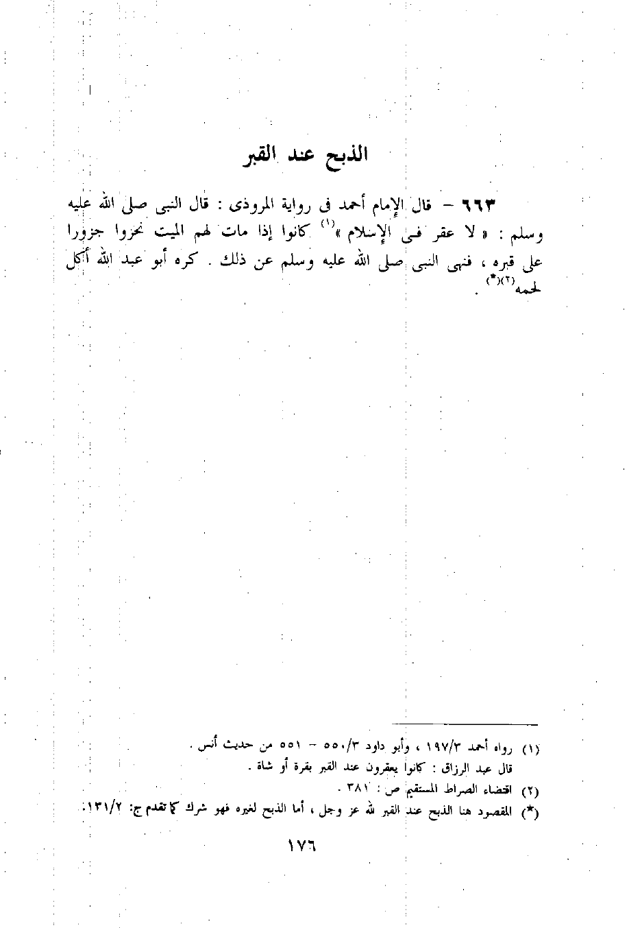 (3) المقصود هنا الذبح عند القبر للّه عز وجل، أما الذبح لغيره فهو شرك كما تقدم ج: 2/ 131.