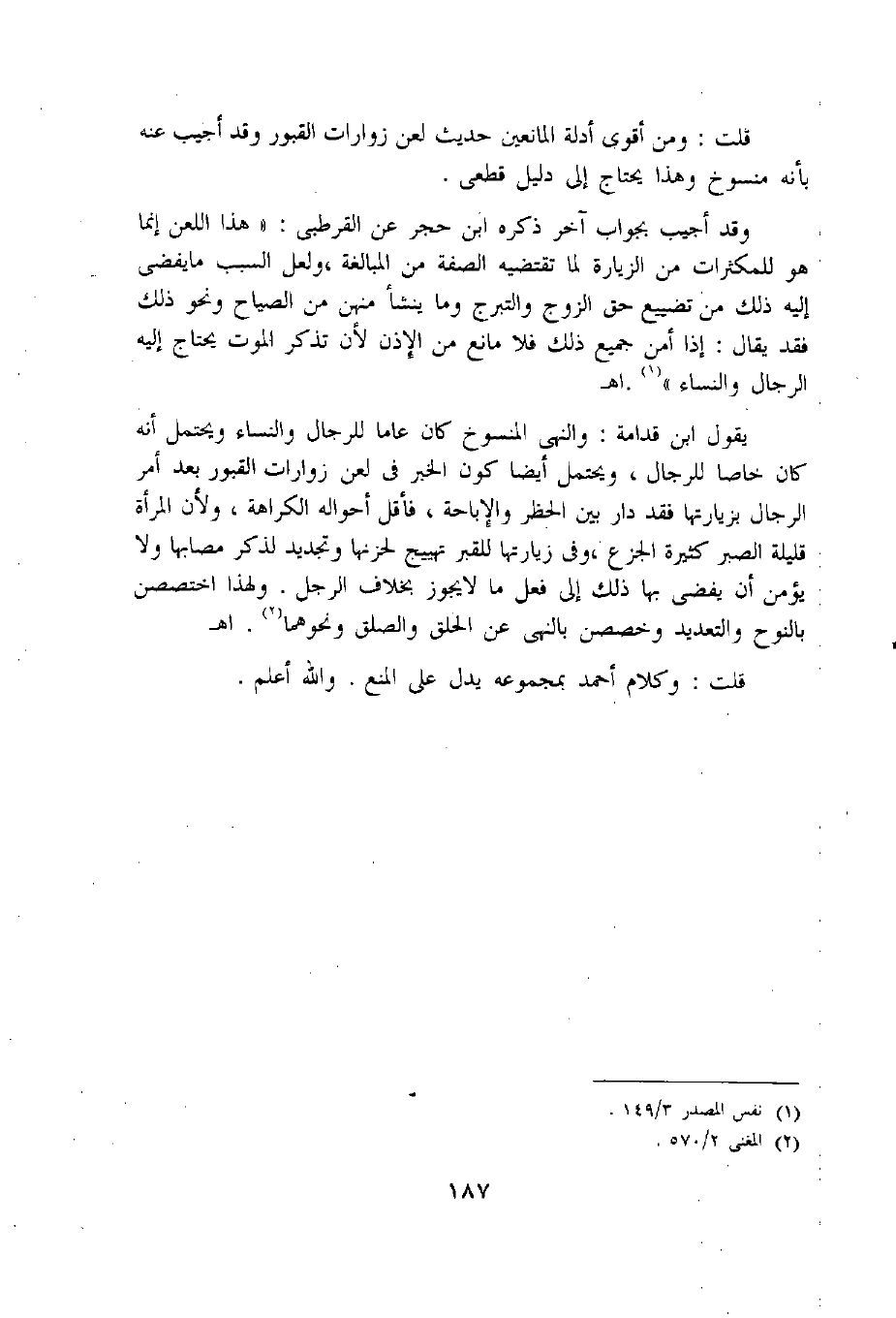 قلت: ومن أقوى أدلة المانعين حديث لعن زوارات القبور وقد أجيب عنه بأنه منسوخ وهذا يحتاج إلى دليل قطعى.
