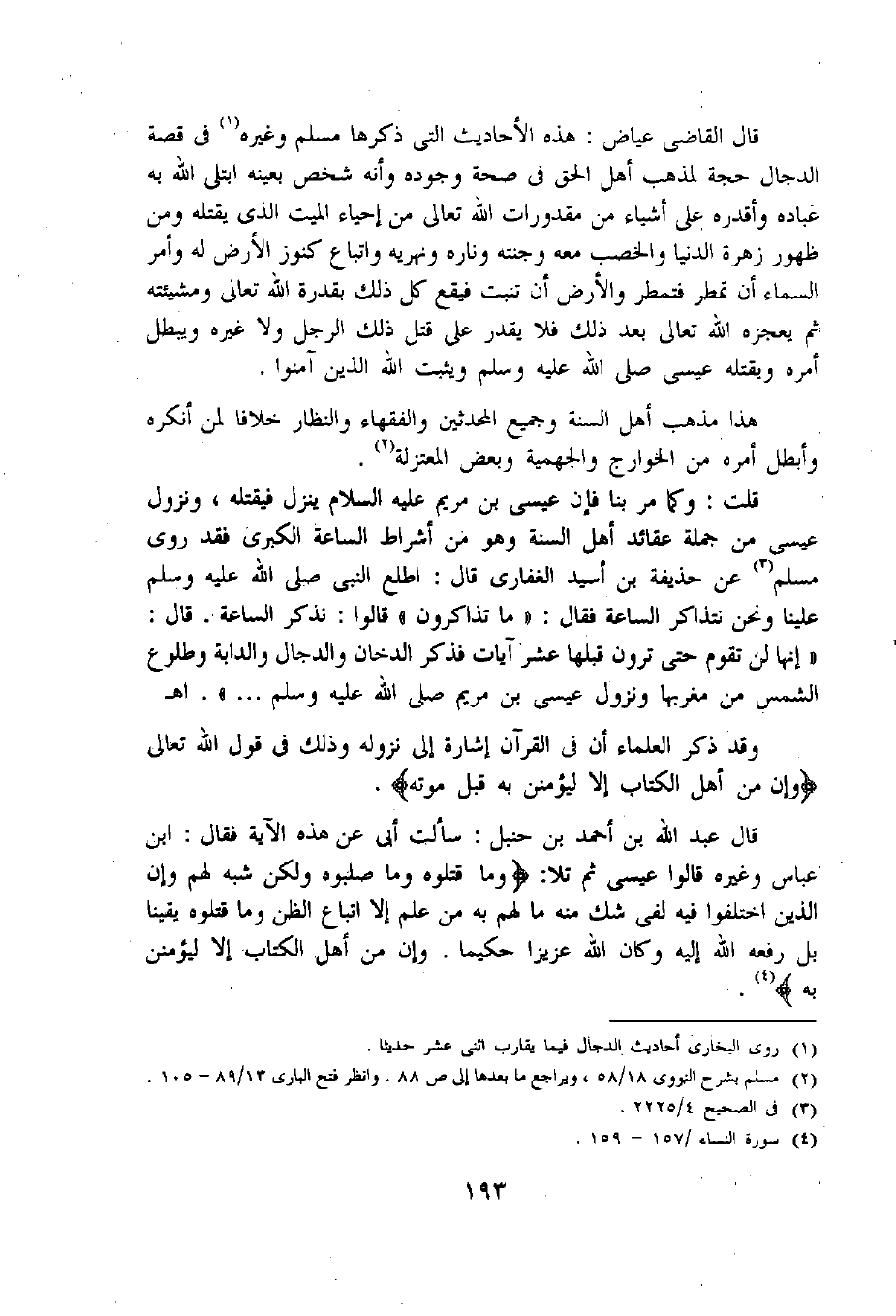 قلت: وكما مر بنا فإن عيسى بن مريم عليه السلام ينزل فيقتله، ونزول عيسى من جملة عقائد أهل السنة وهو من أشراط الساعة الكبرى فقد روى مسلم «3» عن حذيفة بن أسيد الغفارى قال: اطلع النبي صلى اللّه عليه وسلم علينا ونحن نتذاكر الساعة فقال: «ما تذاكرون» قالوا: نذكر الساعة. قال: