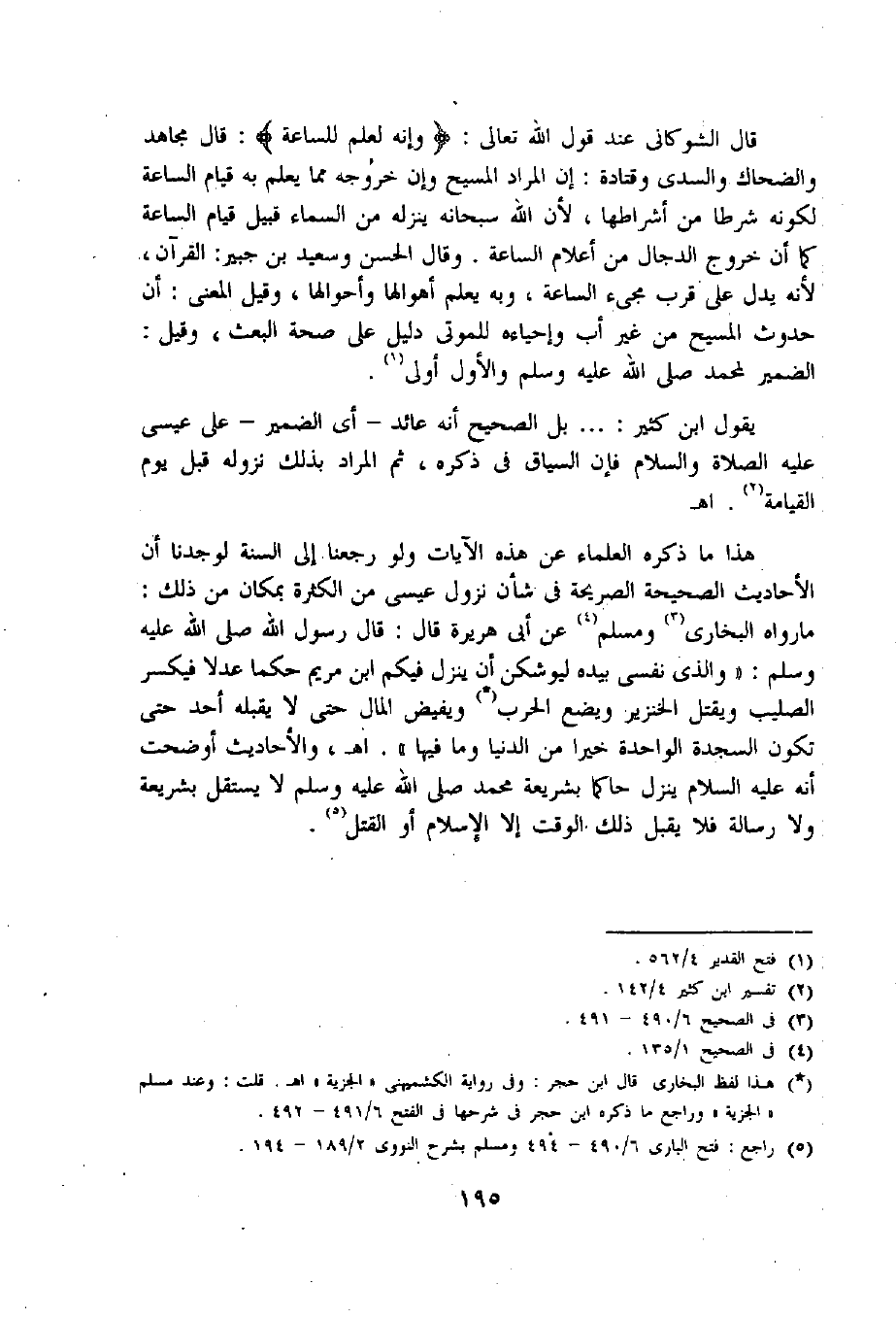 ما رواه البخارى «3» ومسلم «4» عن أبى هريرة قال: قال رسول اللّه صلى اللّه عليه وسلم: «و الّذي نفسى بيده ليوشكن أن ينزل فيكم ابن مريم حكما عدلا فيكسر الصليب ويقتل الخنزير ويضع الحرب «5» ويفيض المال حتى لا يقبله أحد حتى تكون السجدة الواحدة خيرا من الدنيا وما فيها». اه، والأحاديث أوضحت أنه عليه السلام ينزل حاكما بشريعة محمد صلى اللّه عليه وسلم لا يستقل بشريعة ولا رسالة فلا يقبل ذلك الوقت إلا الإسلام أو القتل «6».