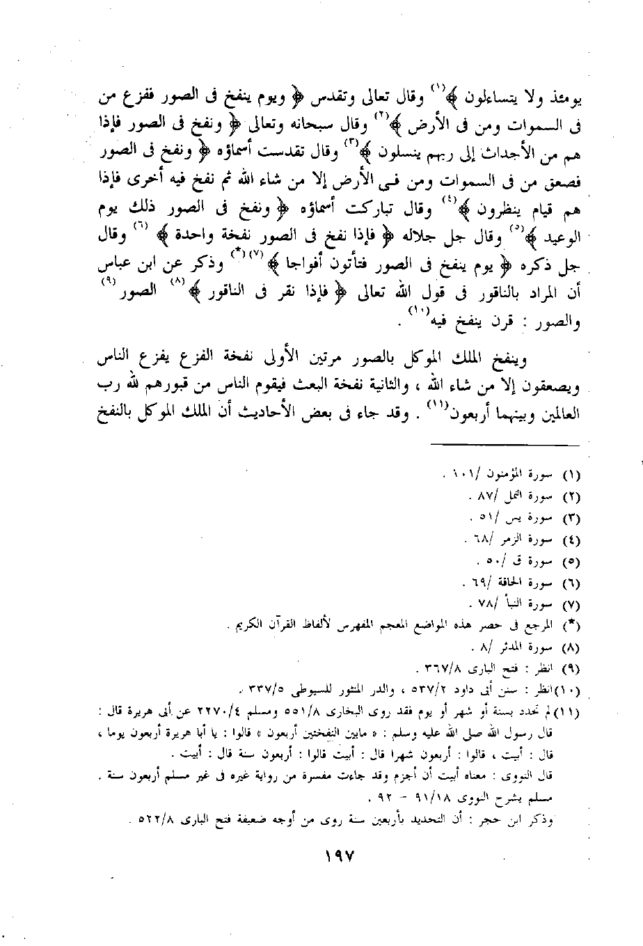 يَوْمَئِذٍ ولا يَتَساءَلُونَ «1» وقال تعالى وتقدس ويَوْمَ يُنْفَخُ فِي الصُّورِ فَفَزِعَ مَنْ فِي السَّماواتِ ومَنْ فِي الْأَرْضِ «2» وقال سبحانه وتعالى ونُفِخَ فِي الصُّورِ فَإِذا هُمْ مِنَ الْأَجْداثِ إِلى رَبِّهِمْ يَنْسِلُونَ «3» وقال تقدست أسماؤه ونُفِخَ فِي الصُّورِ فَصَعِقَ مَنْ فِي السَّماواتِ ومَنْ فِي الْأَرْضِ إِلَّا مَنْ شاءَ اللَّهُ ثُمَّ نُفِخَ فِيهِ أُخْرى فَإِذا هُمْ قِيامٌ يَنْظُرُونَ «4» وقال تباركت أسماؤه ونُفِخَ فِي الصُّورِ ذلِكَ يَوْمُ الْوَعِيدِ «5» وقال جل جلاله فَإِذا نُفِخَ فِي الصُّورِ نَفْخَةٌ واحِدَةٌ «6» وقال جل ذكره يَوْمَ يُنْفَخُ فِي الصُّورِ فَتَأْتُونَ أَفْواجاً «7» «8» وذكر عن ابن عباس أن المراد بالناقور فى قول اللّه تعالى فَإِذا نُقِرَ فِي النَّاقُورِ «9» الصور «10» والصور: قرن ينفخ فيه «11».