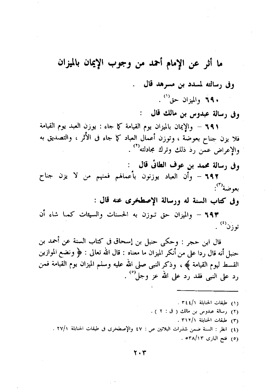 691 - والإيمان بالميزان يوم القيامة كما جاء: يوزن العبد يوم القيامة فلا يزن جناح بعوضة، وتوزن أعمال العباد كما جاء فى الأثر، والتصديق به والإعراض عمن رد ذلك وترك مجادلته «2».