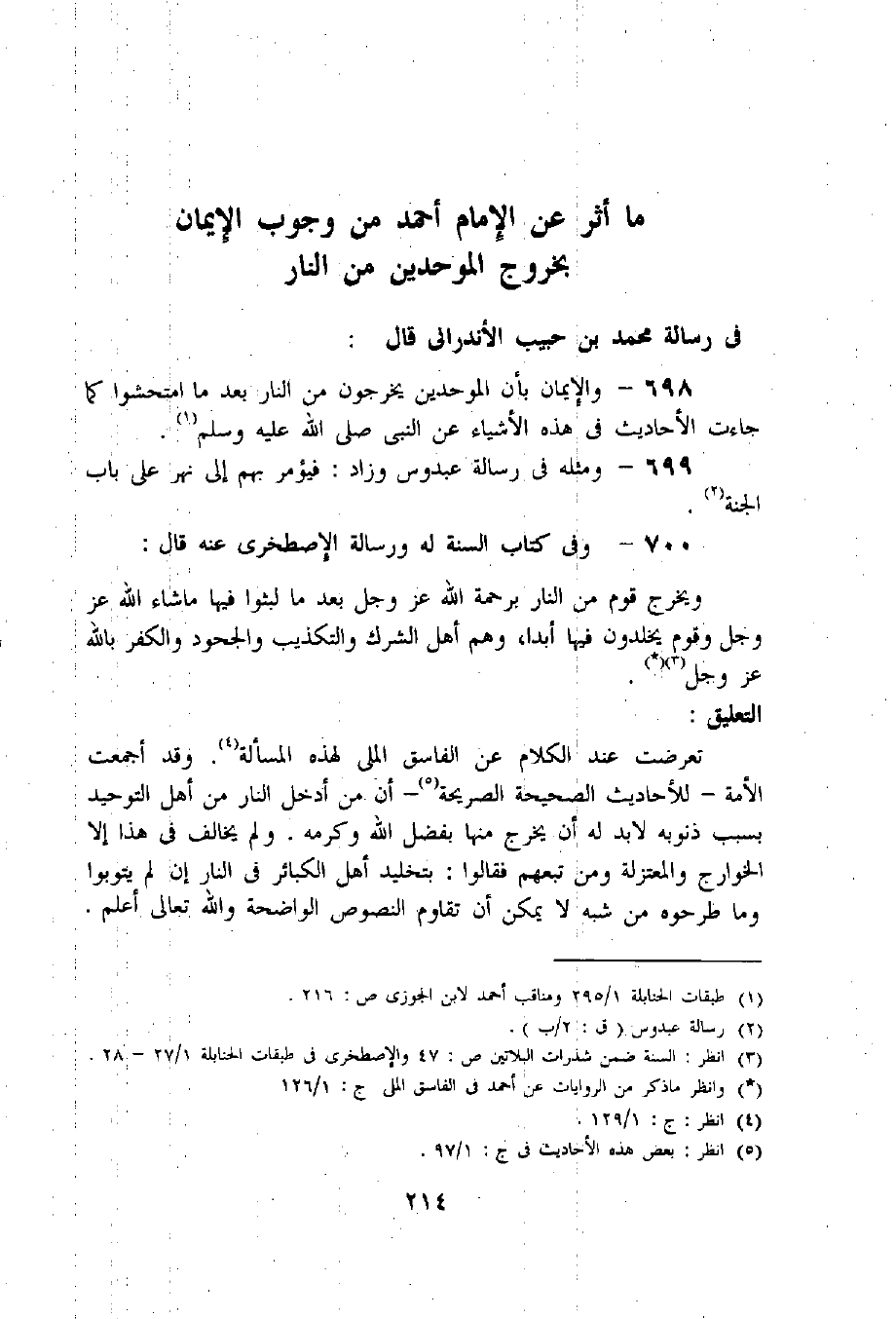 698 - والإيمان بأن الموحدين يخرجون من النار بعد ما امتحشوا كما جاءت الأحاديث فى هذه الأشياء عن النبي صلى اللّه عليه وسلم «1».
