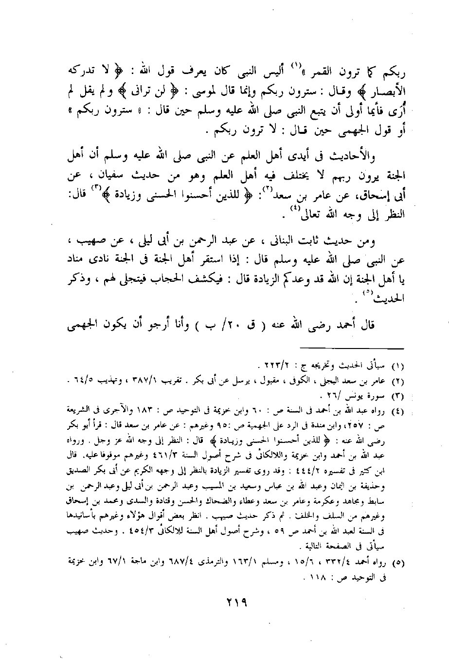 (4) رواه عبد اللّه بن أحمد فى السنة ص: 60 وابن خزيمة فى التوحيد ص: 183 والآجرى فى الشريعة ص: 257، وابن مندة فى الرد على الجهمية ص: 95 وغيرهم: عن عامر بن سعد قال: قرأ أبو بكر رضى اللّه عنه: لِلَّذِينَ أَحْسَنُوا الْحُسْنى وزِيادَةٌ قال: النظر إلى وجه اللّه عز وجل. ورواه عبد اللّه بن أحمد وابن خزيمة واللالكائى فى شرح أصول السنة 3/ 461 وغيرهم موقوفا عليه. قال ابن كثير فى تفسيره 2/ 444: وقد روى تفسير الزيادة بالنظر إلى وجهه الكريم عن أبى بكر الصديق وحذيفة بن اليمان وعبد اللّه بن عباس وسعيد بن المسيب وعبد الرحمن بن أبى ليلى وعبد الرحمن بن سابط ومجاهد وعكرمة وعامر بن سعد وعطاء والضحاك والحسن وقتادة والسدى ومحمد بن إسحاق وغيرهم من السلف والخلف. ثم ذكر حديث صيهب. انظر بعض أقوال هؤلاء وغيرهم بأسانيدها فى السنة لعبد اللّه بن أحمد ص 59، وشرح أصول أهل السنة للالكائى 3/ 454. وحديث صهيب سيأتى فى الصفحة التالية.