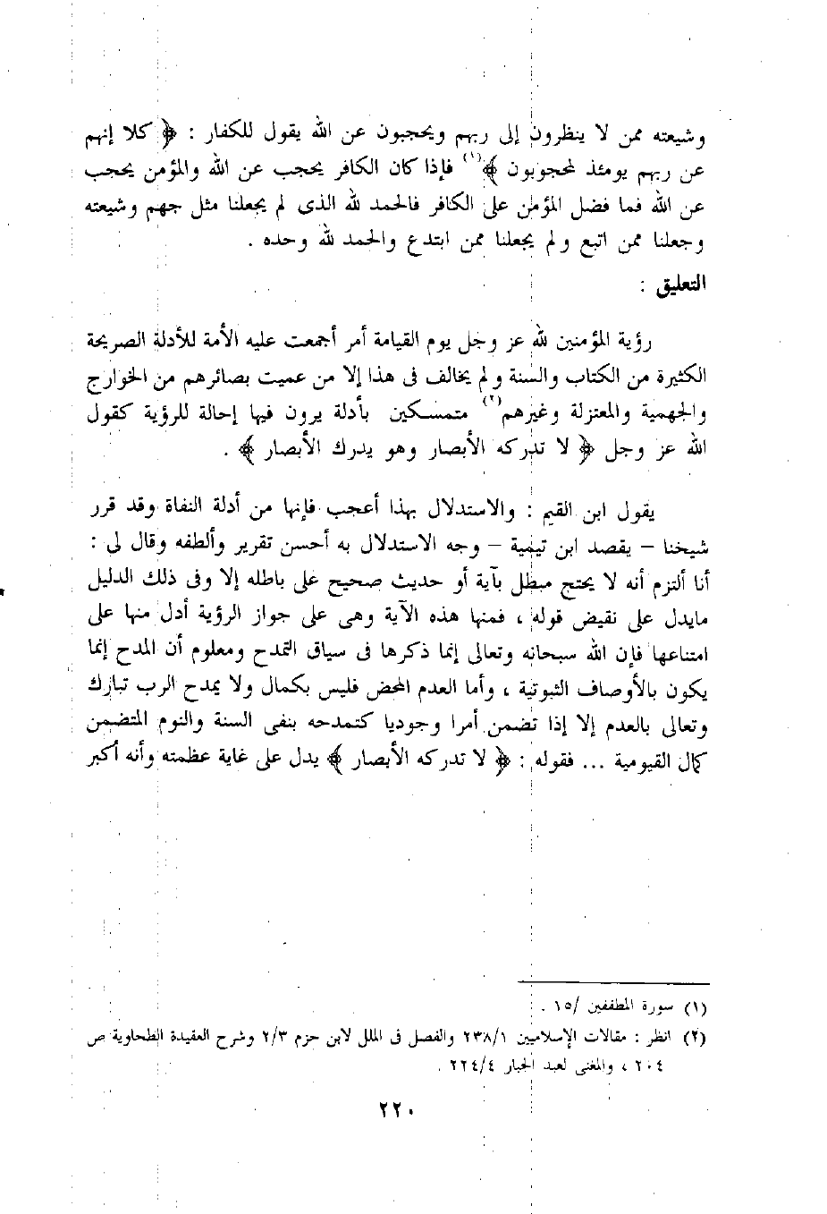 رؤية المؤمنين للّه عز وجل يوم القيامة أمر أجمعت عليه الأمة للأدلة الصريحة الكثيرة من الكتاب والسنة ولم يخالف فى هذا إلا من عميت بصائرهم من الخوارج والجهمية والمعتزلة وغيرهم «2» متمسكين بما يرون فيه إحالة للرؤية كقول اللّه عز وجل لا تُدْرِكُهُ الْأَبْصارُ وهُوَ يُدْرِكُ الْأَبْصارَ.