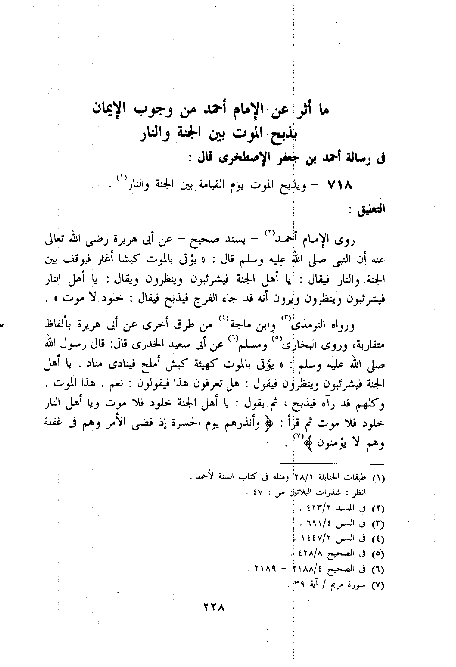 ما أثر عن الإمام أحمد من وجوب الإيمان بذبح الموت بين الجنة والنار