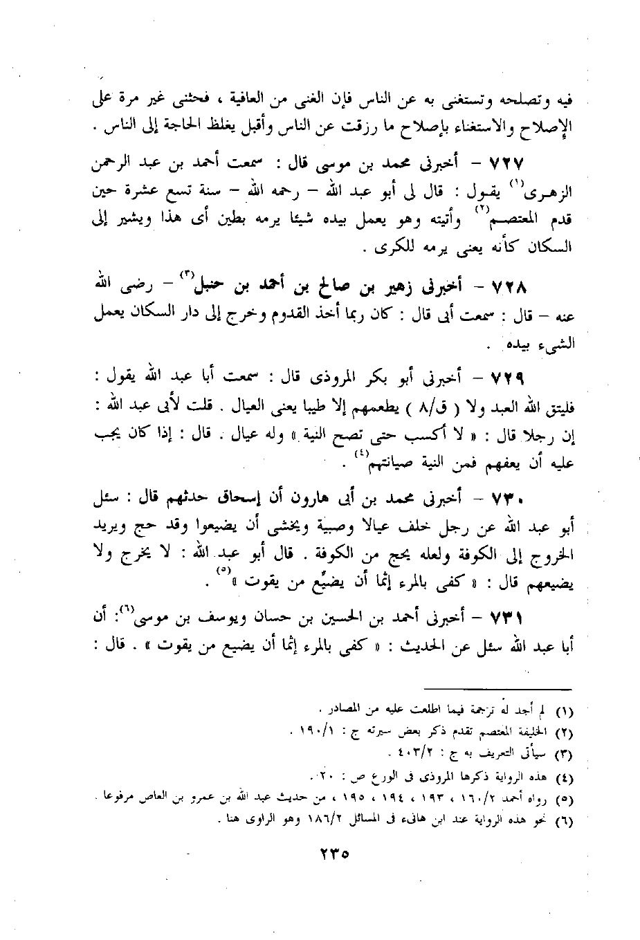728 - أخبرنى زهير بن صالح بن أحمد بن حنبل «3» - رضى اللّه عنه- قال: سمعت أبى قال: كان ربما أخذ القدوم وخرج إلى دار السكان يعمل الشيء بيده.