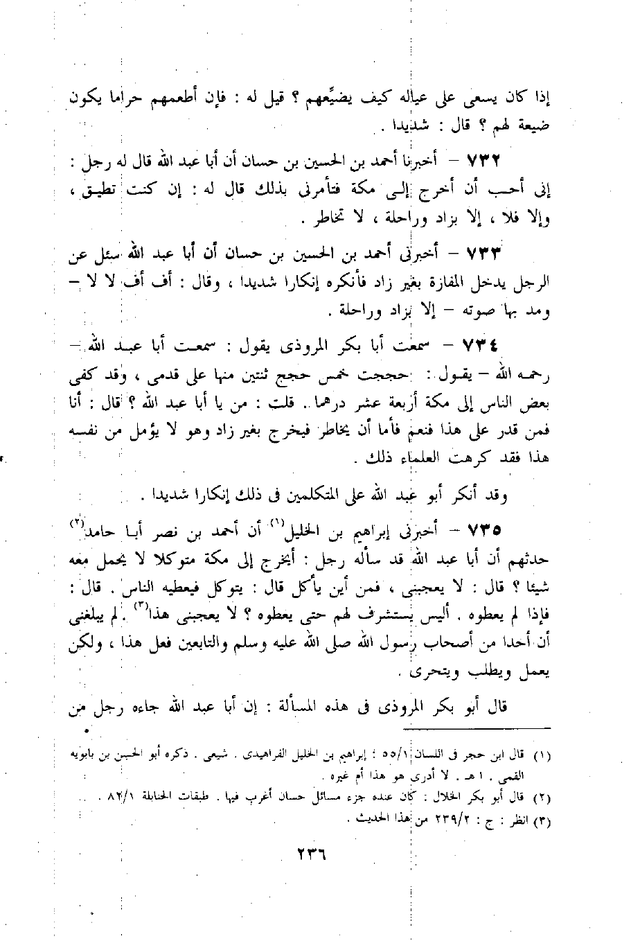 734 - سمعت أبا بكر المروزي يقول: سمعت أبا عبد اللّه- رحمه اللّه- يقول: حججت خمس حجج ثنتين منها على قدمى، وقد كفى بعض الناس إلى مكة أربعة عشر درهما. قلت: من يا أبا عبد اللّه؟ قال: أنا فمن قدر على هذا فنعم فأما أن يخاطر فيخرج بغير زاد وهو لا يؤمل من نفسه هذا فقد كرهت العلماء ذلك.