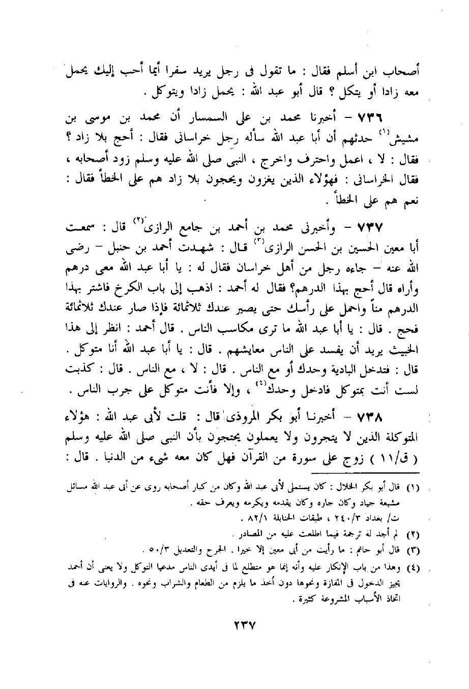 736 - أخبرنا محمد بن على السمسار أن محمد بن موسى بن مشيش «1» حدثهم أن أبا عبد اللّه سأله رجل خراسانى فقال: أحج بلا زاد؟