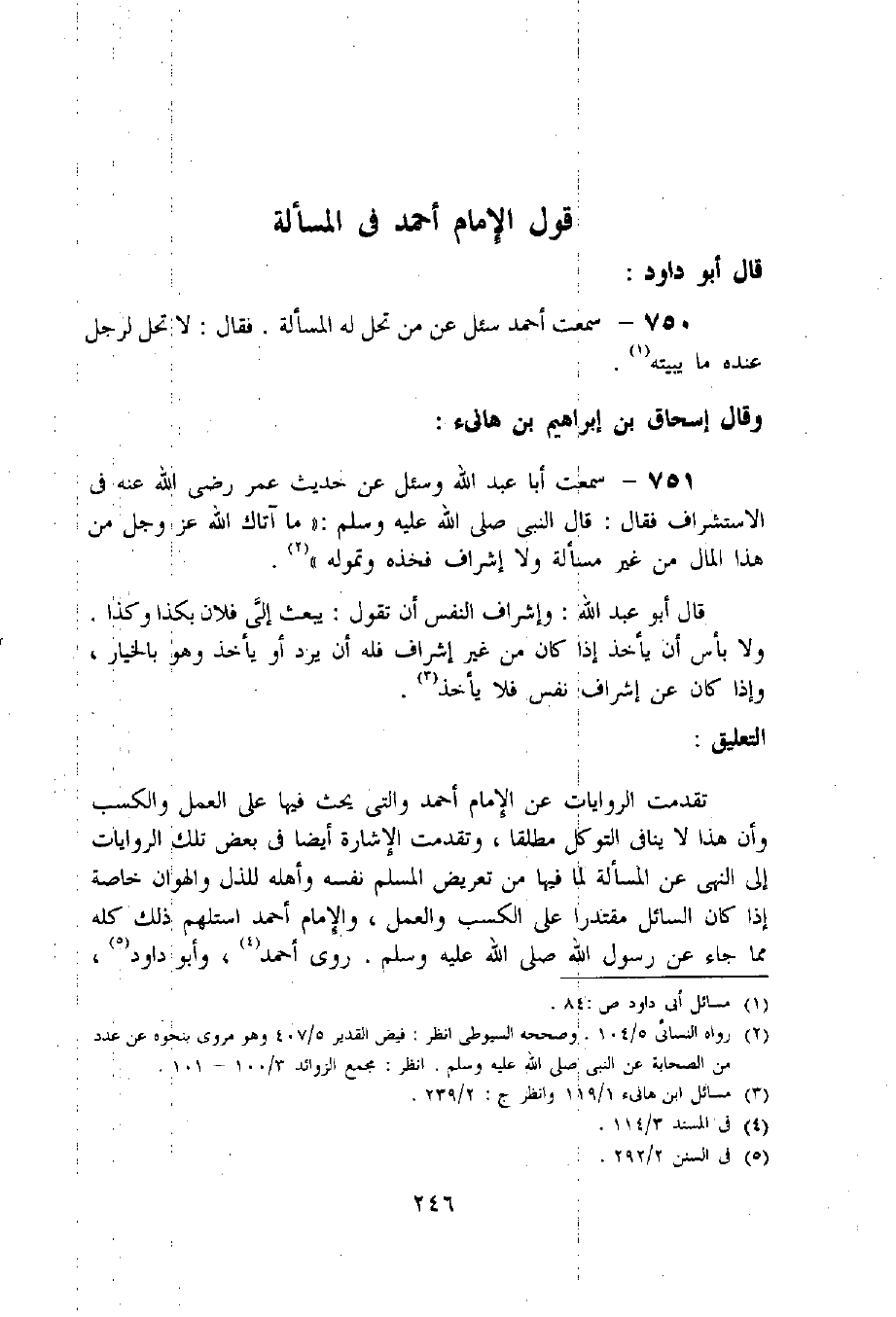 751 - سمعت أبا عبد اللّه وسئل عن حديث عمر رضى اللّه عنه فى الاستشراف فقال: قال النبي صلى اللّه عليه وسلم: «ما آتاك اللّه عز وجل من هذا المال من غير مسألة ولا إشراف فخذه وتموله» «2».