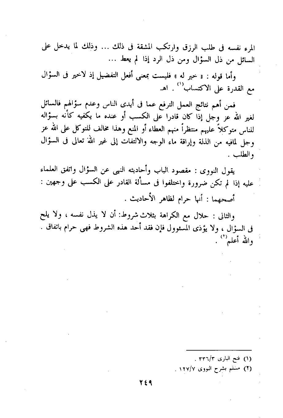 يقول النووى: مقصود الباب وأحاديثه النهى عن السؤال واتفق العلماء عليه إذا لم تكن ضرورة واختلفوا فى مسألة القادر على الكسب على وجهين: