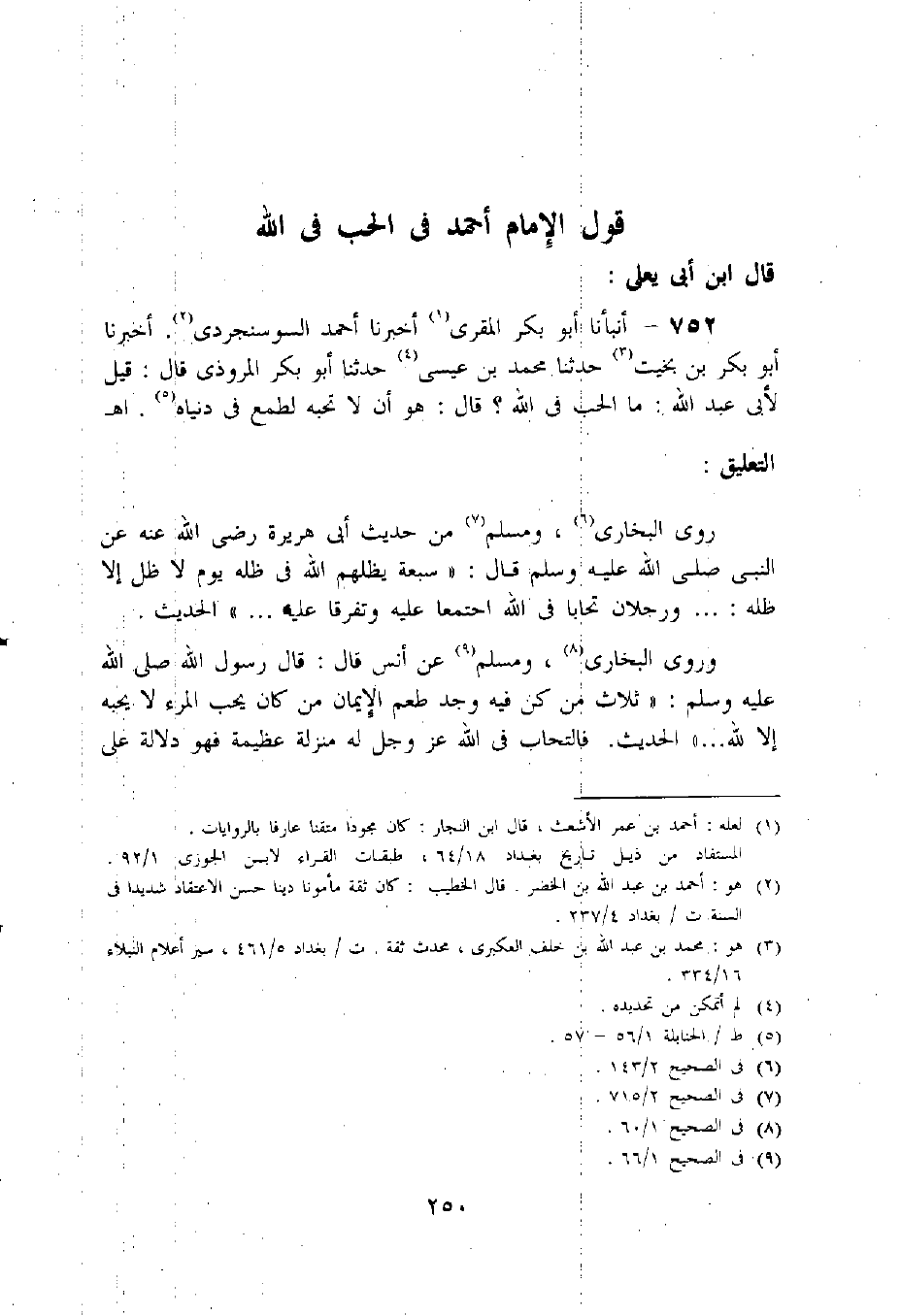 752 - أنبأنا أبو بكر المقرى «1» أخبرنا أحمد السوسنجردى «2». أخبرنا أبو بكر بن بخيت «3» حدثنا محمد بن عيسى «4» حدثنا أبو بكر المروزي قال: قيل لأبى عبد اللّه: ما الحب فى اللّه؟ قال: هو أن لا تحبه لطمع فى دنياه «5». اه