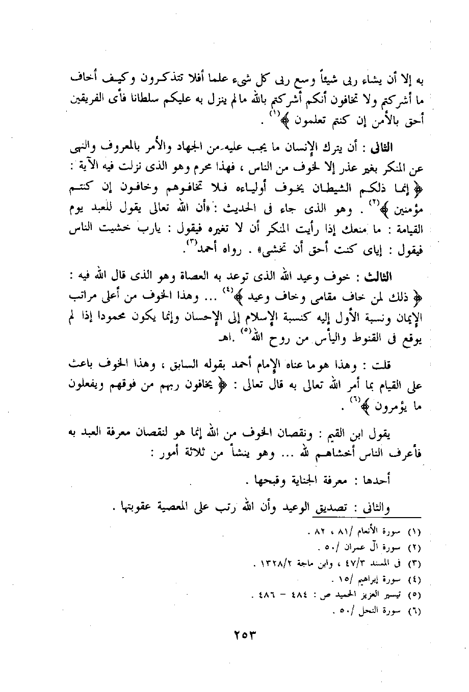 ذلِكَ لِمَنْ خافَ مَقامِي وخافَ وَعِيدِ «4» ... وهذا الخوف من أعلى مراتب الإيمان ونسبة الأول إليه كنسبة الإسلام إلى الإحسان وإنما يكون محمودا إذا لم يوقع فى القنوط واليأس من روح اللّه «5». اه