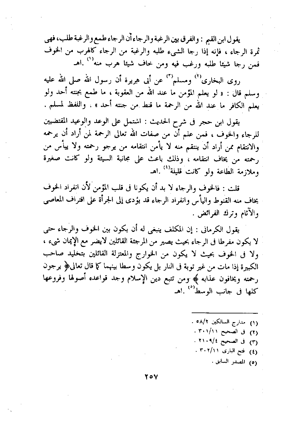 يقول الكرمانى: إن المكلف ينبغى له أن يكون بين الخوف والرجاء حتى لا يكون مفرطا فى الرجاء بحيث يصير من المرجئة القائلين لا يضر مع الإيمان شيء، ولا فى الخوف بحيث لا يكون من الخوارج والمعتزلة القائلين بتخليد صاحب الكبيرة إذا مات من غير توبة فى النار بل يكون وسطا بينهما كما قال تعالى يَرْجُونَ رَحْمَتَهُ ويَخافُونَ عَذابَهُ ومن تتبع دين الإسلام وجد قواعده أصولها وفروعها كلها فى جانب الوسط «5». اه