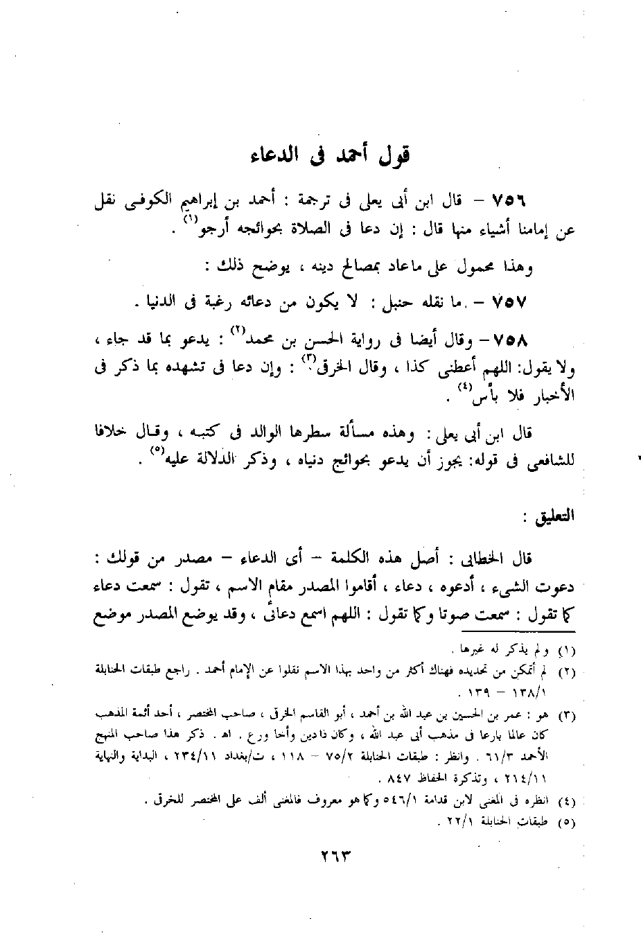 756 - قال ابن أبى يعلى فى ترجمة: أحمد بن إبراهيم الكوفى نقل عن إمامنا أشياء منها قال: إن دعا فى الصلاة بحوائجه أرجو «1».