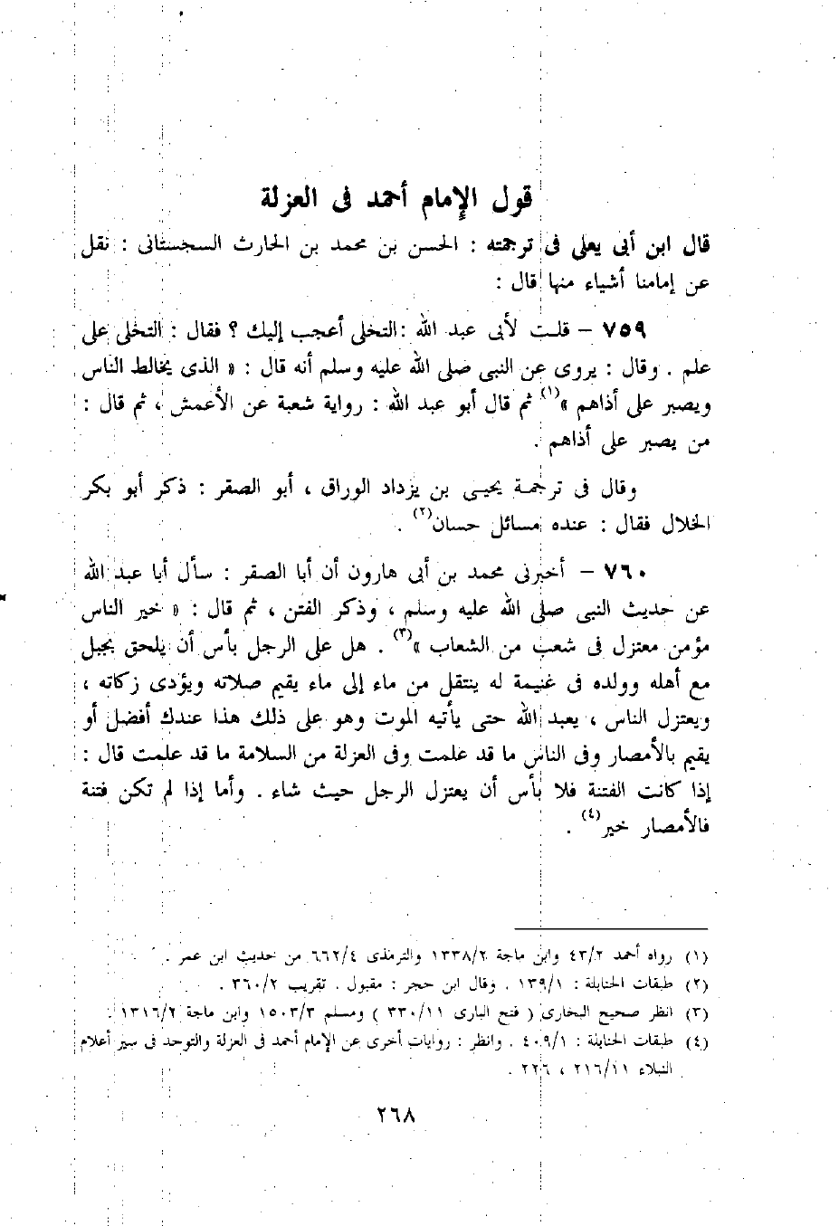 (4) طبقات الحنابلة: 1/ 409. وانظر: روايات أخرى عن الإمام أحمد فى العزلة والتوحد فى سير أعلام النبلاء 11/ 216، 226.