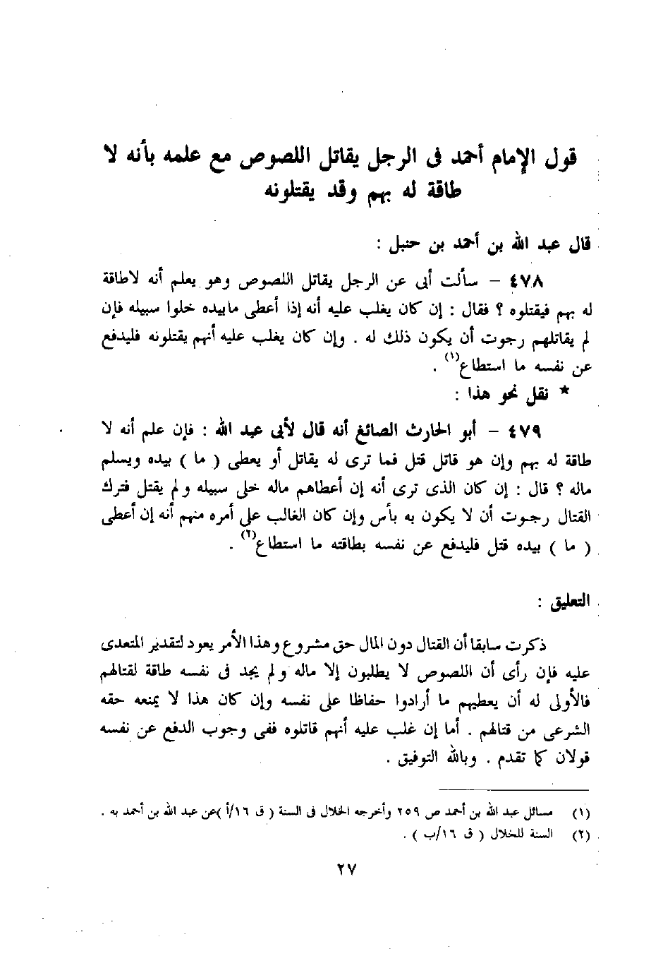 478 - سألت أبى عن الرجل يقاتل اللصوص وهو يعلم أنه لا طاقة له بهم فيقتلوه؟ فقال: إن كان يغلب عليه أنه إذا أعطى ما بيده خلوا سبيله فإن لم يقاتلهم رجوت أن يكون ذلك له. وإن كان يغلب عليه أنهم يقتلونه فليدفع عن نفسه ما استطاع «1».