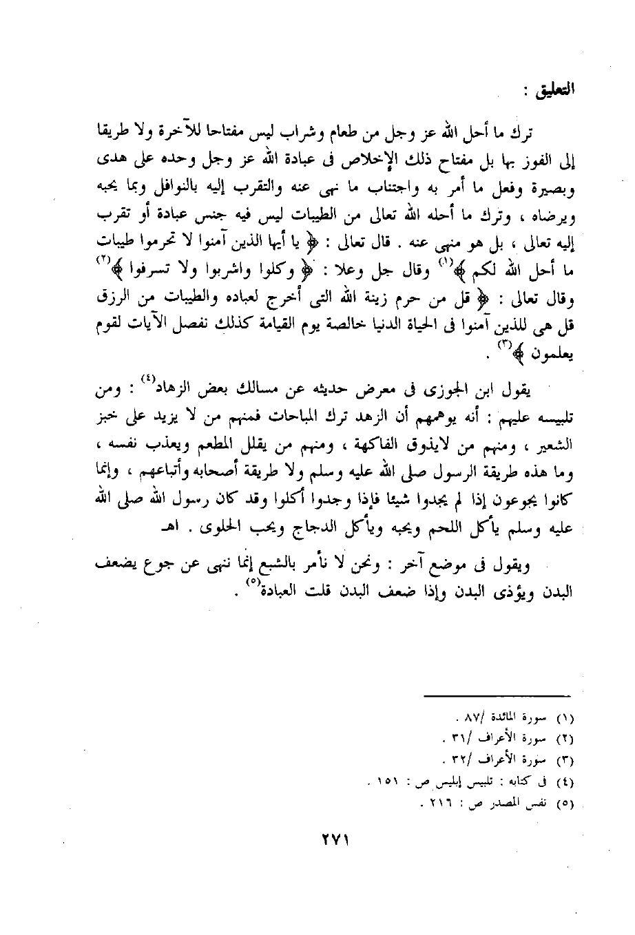 يقول ابن الجوزى فى معرض حديثه عن مسالك بعض الزهاد «4»: ومن تلبيسه عليهم: أنه يوهمهم أن الزهد ترك المباحات فمنهم من لا يزيد على خبز الشعير، ومنهم من لا يذوق الفاكهة، ومنهم من يقلل المطعم ويعذب نفسه، وما هذه طريقة الرسول صلى اللّه عليه وسلم ولا طريقة أصحابه وأتباعهم، وإنما كانوا يجوعون إذا لم يجدوا شيئا فإذا وجدوا أكلوا وقد كان رسول اللّه صلى اللّه عليه وسلم يأكل اللحم ويحبه ويأكل الدجاج ويحب الحلوى. اه