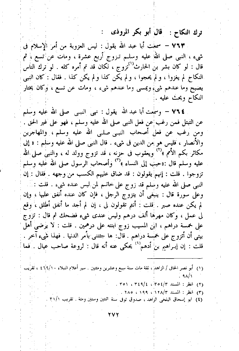 763 - سمعت أبا عبد اللّه يقول: ليس العزوبة من أمر الإسلام فى شيء، النبي صلى اللّه عليه وسلم تزوج أربع عشرة، ومات عن تسع، ثم قال: لو كان بشر بن الحارث «1» تزوج، لكان قد تم أمره كله. لو ترك الناس النكاح لم يغزوا، ولم يحجوا، ولم يكن كذا ولم يكن كذا. فقال: كان النبي يصبح وما عندهم شيء ويمسى وما عندهم شيء، ومات عن تسع، وكان يختار النكاح ويحث عليه.