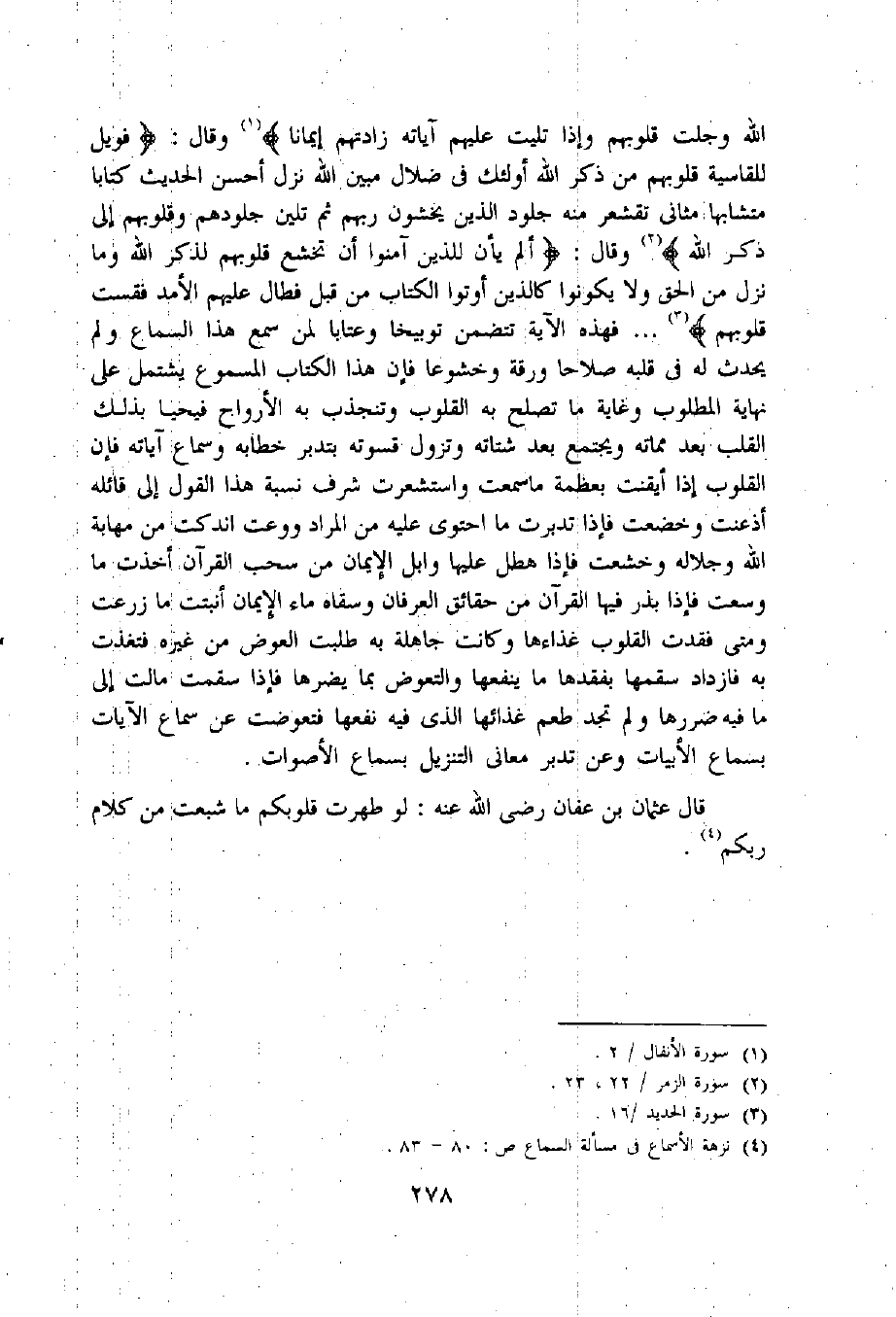 قال عثمان بن عفان رضى اللّه عنه: لو طهرت قلوبكم ما شبعت من كلام ربكم «4».