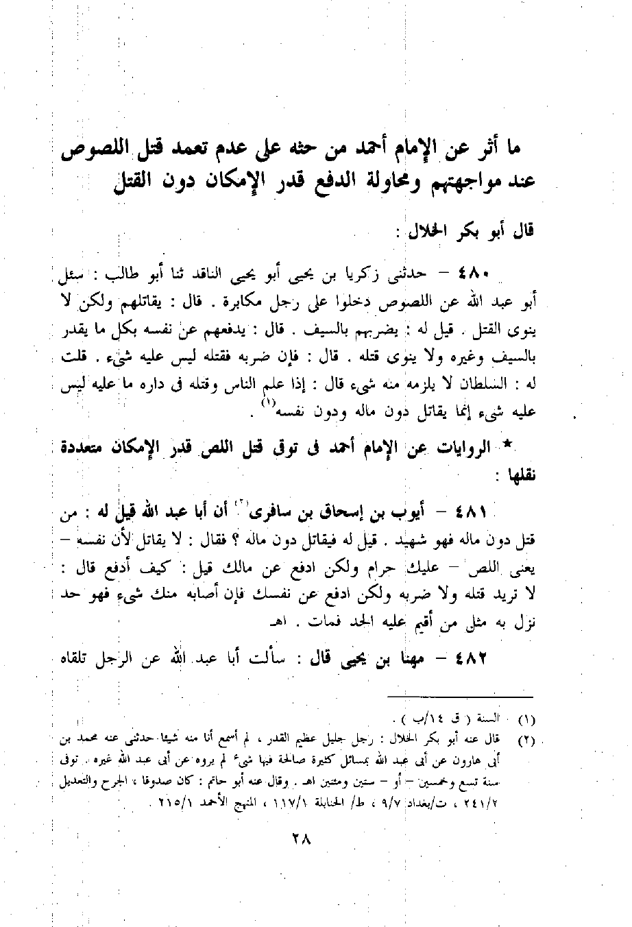 480 - حدثنى زكريا بن يحيى أبو يحيى الناقد حدثنا أبو طالب: سئل أبو عبد اللّه عن اللصوص دخلوا على رجل مكابرة. قال: يقاتلهم ولكن لا ينوى القتل. قيل له: يضربهم بالسيف. قال: يدفعهم عن نفسه بكل ما يقدر بالسيف وغيره ولا ينوى قتله. قال: فإن ضربه فقتله ليس عليه شيء. قلت له: السلطان لا يلزمه منه شيء قال: إذا علم الناس وقتله فى داره ما عليه ليس عليه شيء إنما يقاتل دون ماله ودون نفسه «1».