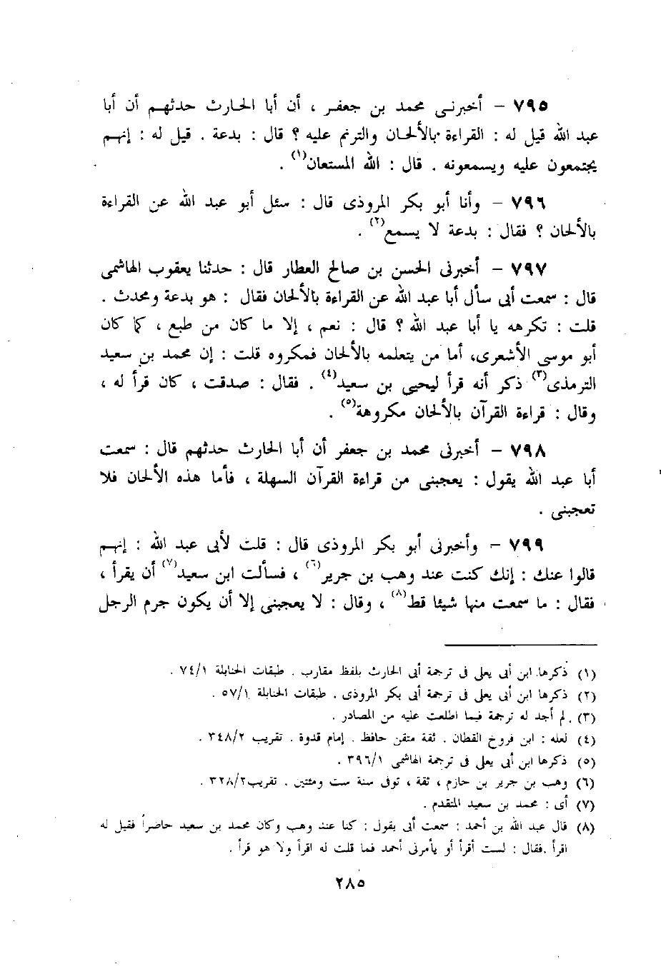 796 - وأنا أبو بكر المروزي قال: سئل أبو عبد اللّه عن القراءة بالألحان؟ فقال: بدعة لا يسمع «2».