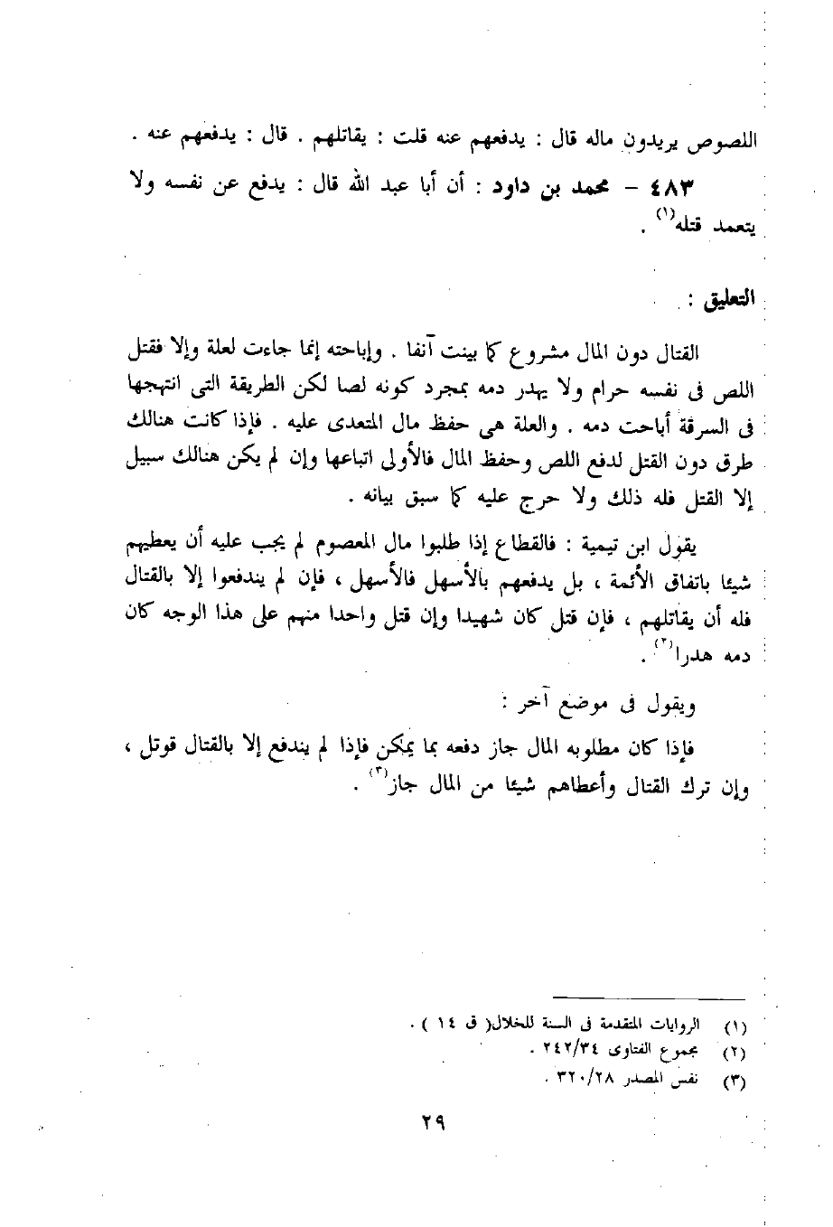 يقول ابن تيمية: فالقطاع إذا طلبوا مال المعصوم لم يجب عليه أن يعطيهم شيئا باتفاق الأئمة، بل يدفعهم بالأسهل فالأسهل، فإن لم يندفعوا إلا بالقتال فله أن يقاتلهم، فإن قتل كان شهيدا وإن قتل واحدا منهم على هذا الوجه كان دمه هدرا «2».