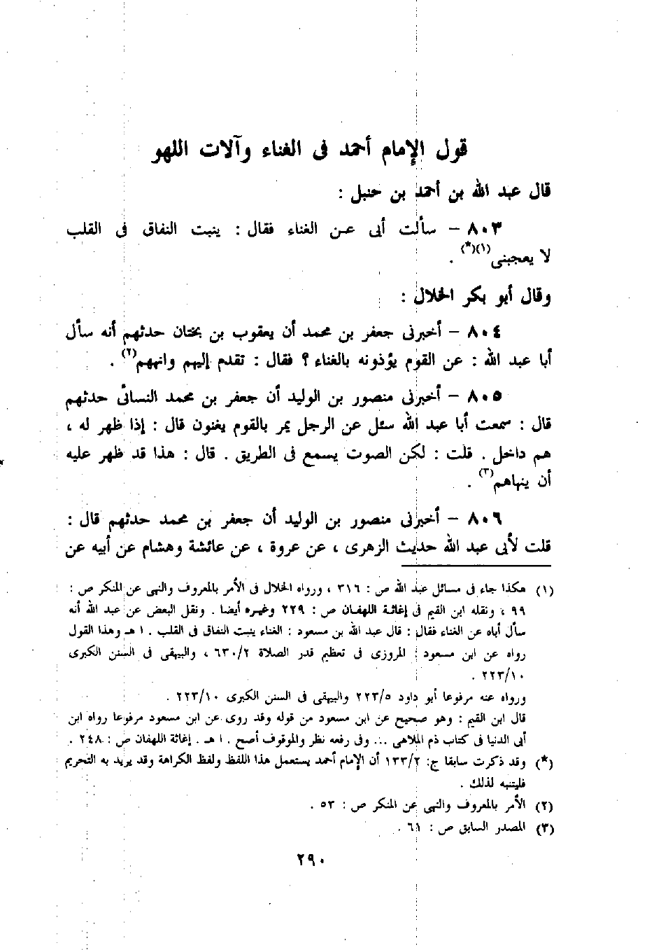 803 - سألت أبى عن الغناء فقال: ينبت النفاق فى القلب لا يعجبنى «1» «2».