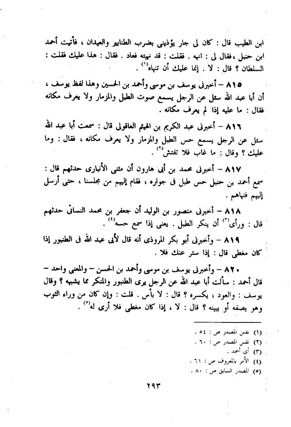 ابن الطيب قال: كان لى جار يؤذينى بضرب الطنابير والعيدان، فأتيت أحمد ابن حنبل، فقال لى: انهه. فقلت: قد نهيته فعاد. فقال: هذا عليك فقلت: